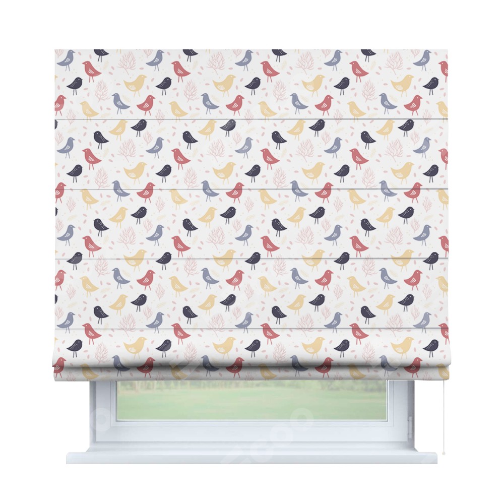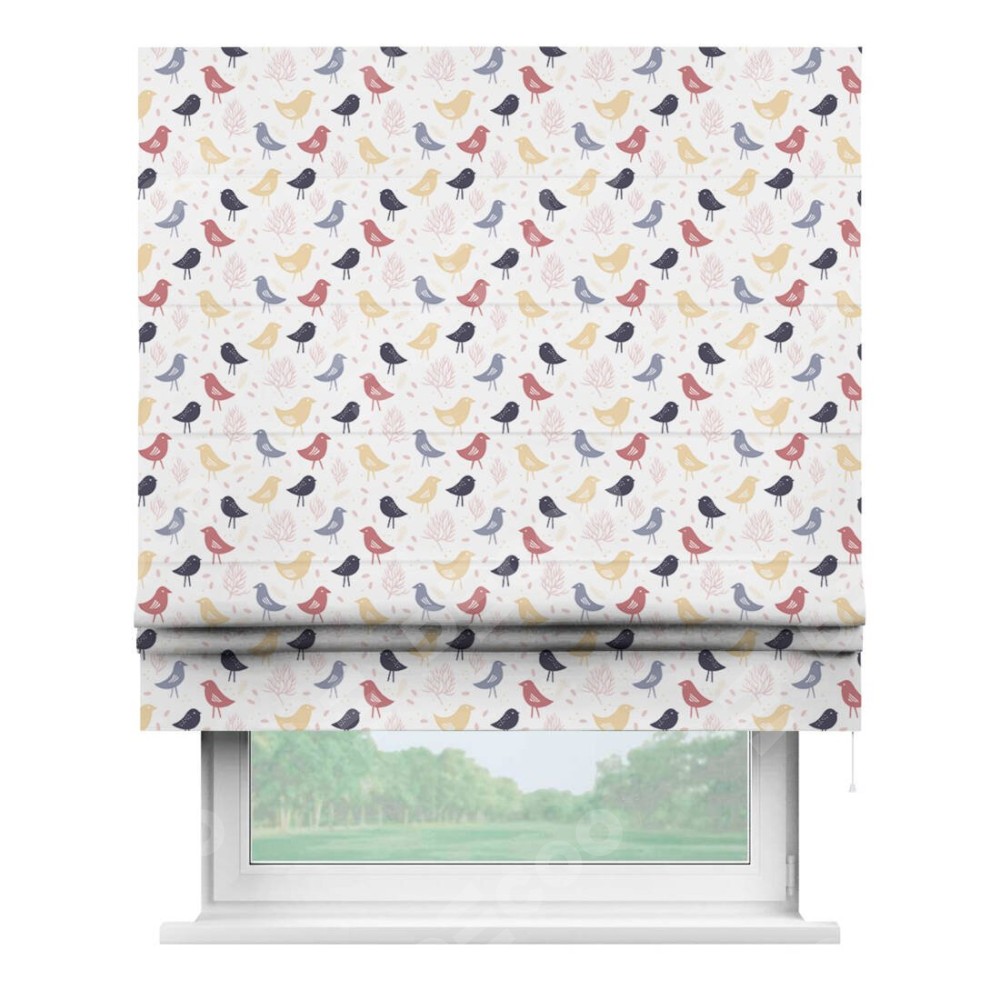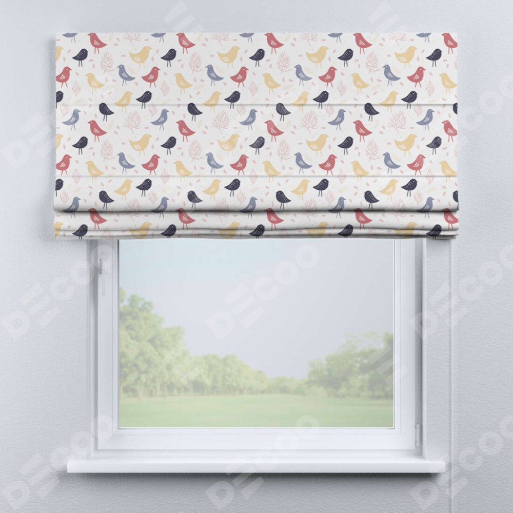 Классическая римская штора производителя «Cortin», пошита из ткани блэкаут с нанесением сублимационной печати «Цветные птички». Имеет универсальный механизм и подходит для монтажа: на потолок, на стену и в нишу.
