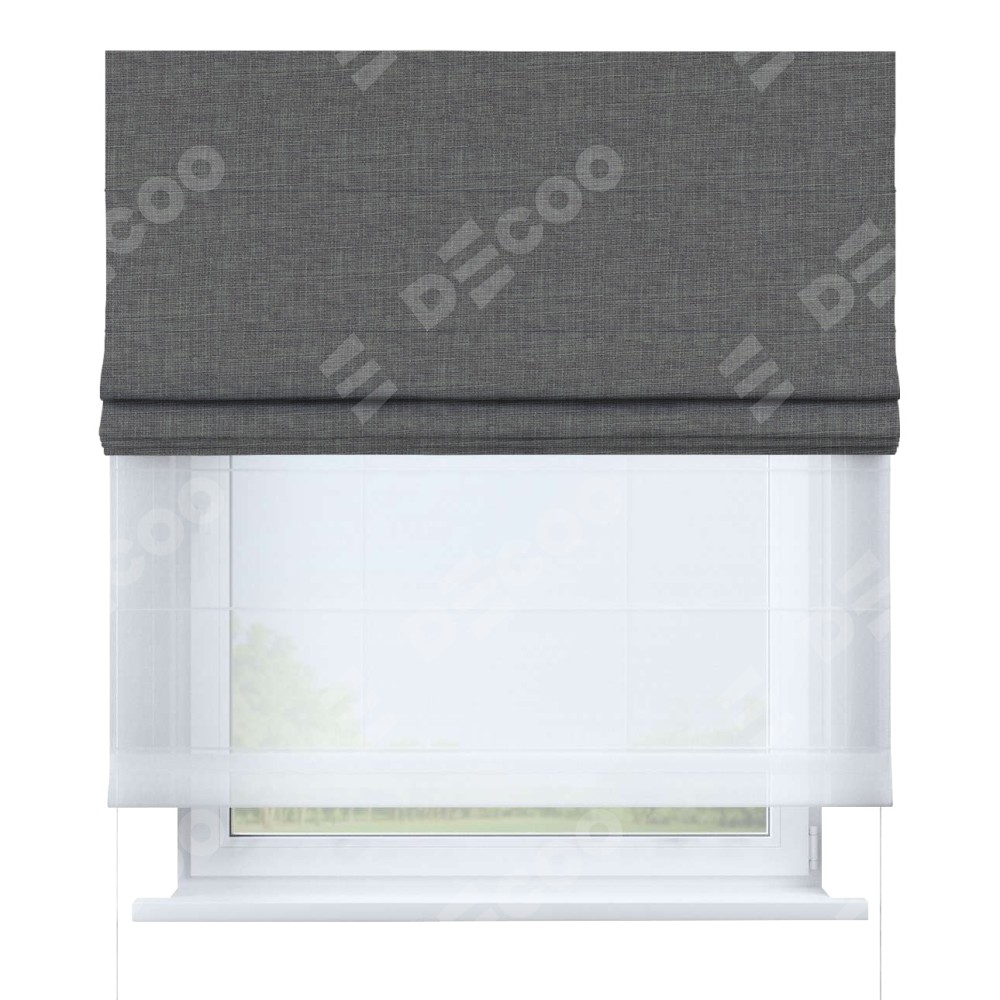 Двойная римская штора «День-ночь» от производителя Cortin предназначена для использования в проёмах. Эта штора уникальна тем, что состоит из двух полотен. На лицевой стороне находится лён тёмно-серый (артикул: 7441), обеспечивающий мягкое затемнение. В комплект также входит вторая ткань — легкий белый тюль (артикул: V-01), который добавляет изящества и легкости оформлению окна. Кроме того, доступны и другие разновидности ткани тюль, выбор которых доступен по  ссылке .