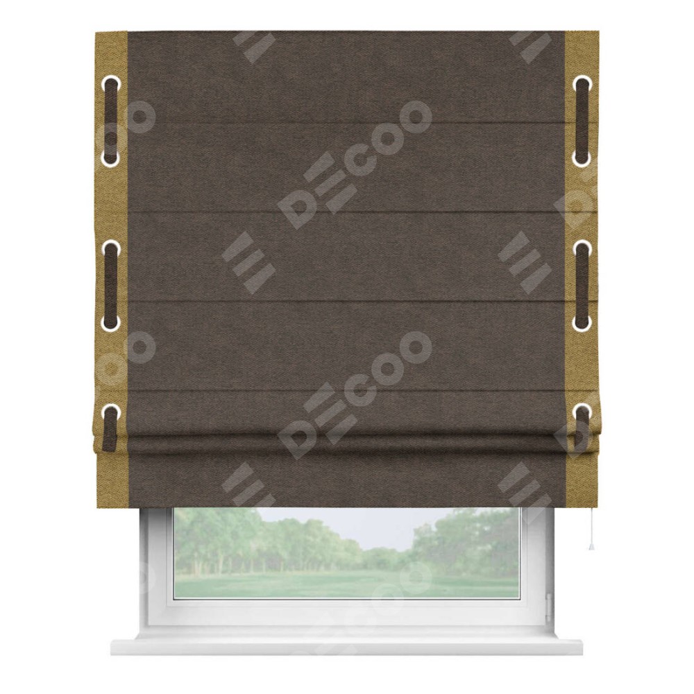 Римская штора производителя «Cortin», используется для проёма, пошита из ткани твид блэкаут тёмно-коричневый, артикул 90933. Отделка шторы кантом «Стрим Дуо» на кантах расположены люверсы с пояском, ткань для канта используется из твида разной расцветки на выбор. Ткань для пояска обычно используется из основной ткани шторы, а так же можно сделать из любой расцветки по желанию. Имеет универсальный механизм и подходит для монтажа: на потолок, на стену и в нишу.