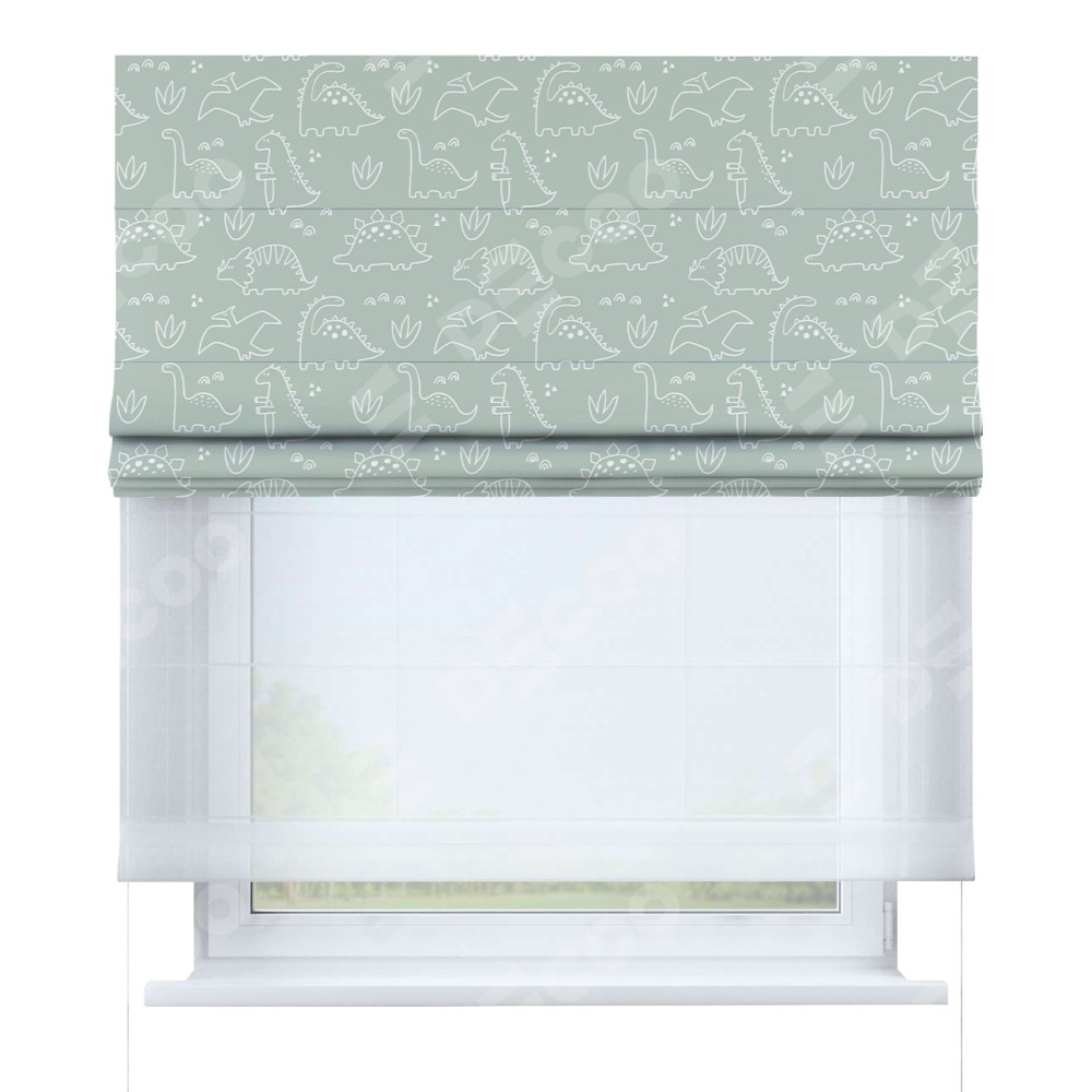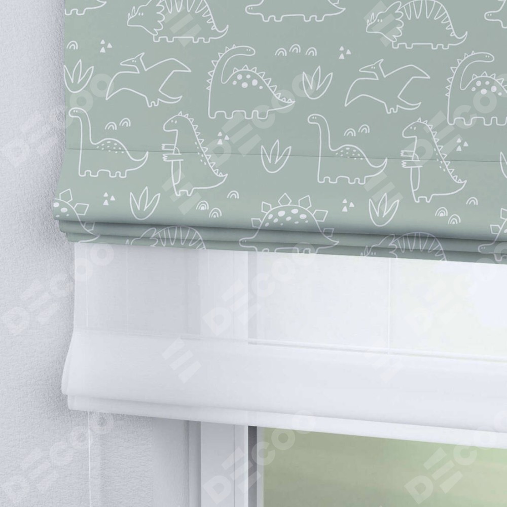 Двойная римская штора «День-ночь» от производителя Cortin предназначена для использования в проёмах. Эта штора уникальна тем, что состоит из двух полотен. На лицевой стороне находится блэкаут с нанесением сублимационной печати «Динопарк», обеспечивающий эффективное затемнение. В комплект также входит вторая ткань — легкий белый тюль (артикул: V-01), который добавляет изящества и легкости оформлению окна. Кроме того, доступны и другие разновидности ткани тюль, выбор которых доступен по  ссылке .