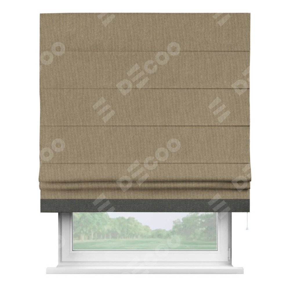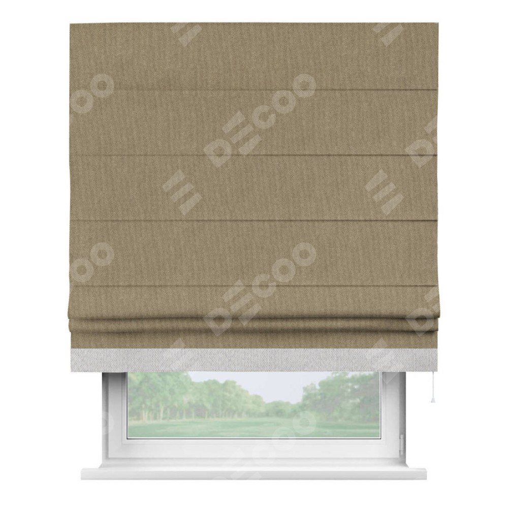 Римская штора пошита из ткани лён димаут тёмно-бежевый, артикул: 16261, с отделкой кантом «Джестер» выделяется своей уникальной особенностью — кантом, расположенным только снизу шторы. Этот дизайн добавляет оригинальности и игривости оконному оформлению, делая акцент на нижней части шторы и создавая интересный визуальный эффект. Отделка кантом на нижнем крае не только служит эстетической функции, но и способствует увеличению прочности и износостойкости ткани в этом месте.