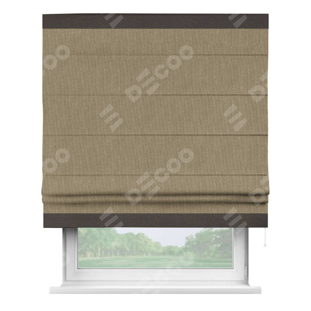 Римская штора пошита из ткани лён димаут тёмно-бежевый, артикул: 16261, с отделкой кантом «Горизонт» предлагает уникальное дизайнерское решение, при котором кант располагается только вверху и снизу шторы. Такое решение делает акцент на горизонтальных линиях, визуально расширяя пространство и придавая окну более строгий и организованный вид. Отделка кантом в этих ключевых местах не только украшает штору, но и способствует её долговечности, защищая наиболее уязвимые к износу края.