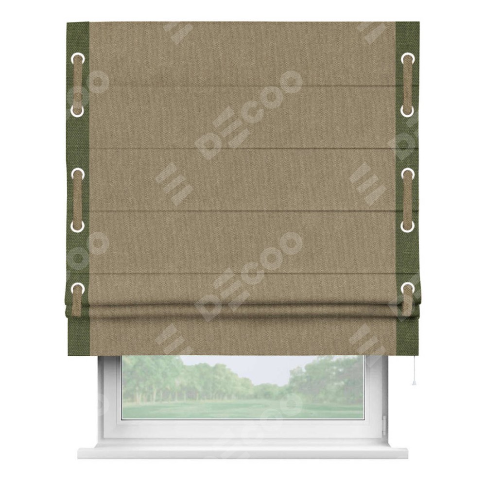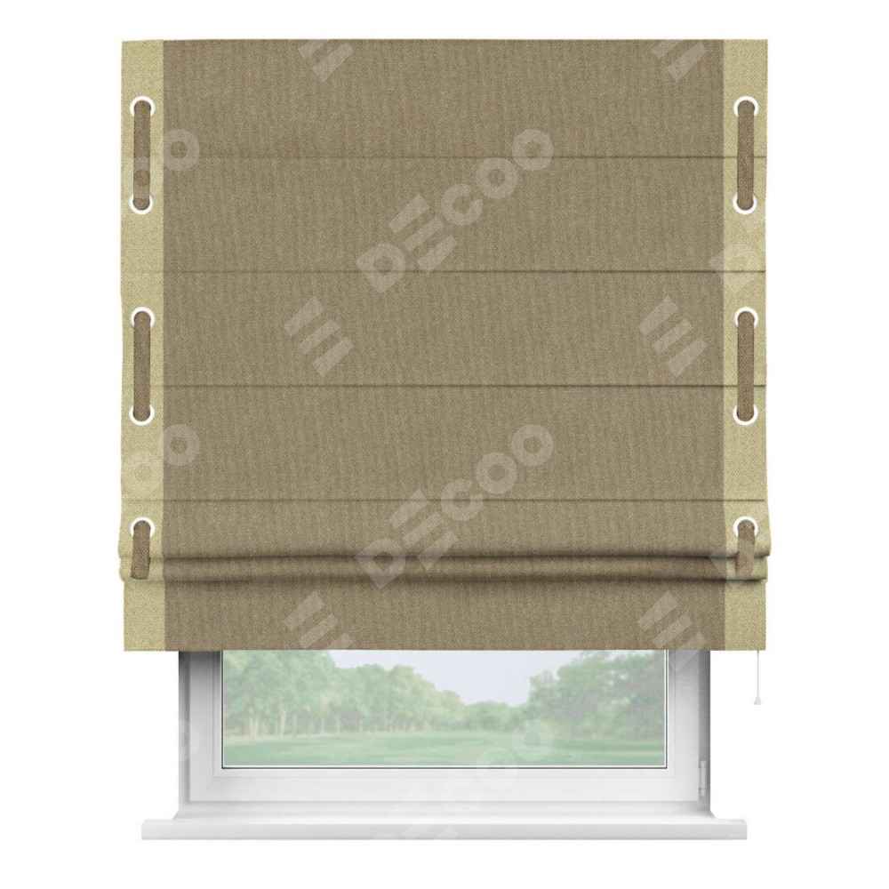 Римская штора пошита из ткани лён димаут тёмно-бежевый, артикул: 16261, с отделкой кантом «Стрим Дуо», дополненная декоративными люверсами на этих кантах и протянутым пояском из основного цвета римской шторы, представляет собой высоко декоративное и функциональное решение для оконного оформления. Канты, расположенные по обеим боковым сторонам шторы, уже добавляют изысканности и завершенности внешнему виду. Добавление люверсов и пояска не только усиливает декоративный эффект, но и придает шторе дополнительную текстурность и глубину.