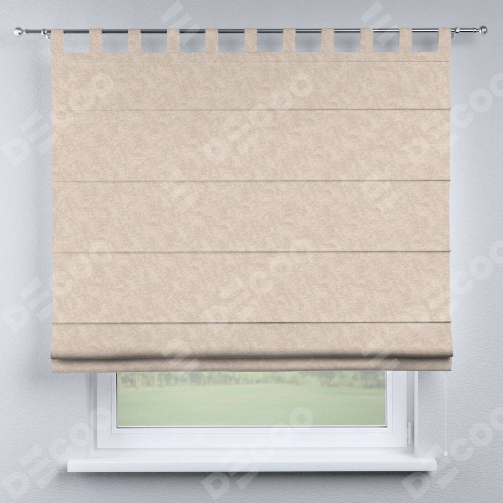 Римская штора производителя «Cortin», используется для проёма, пошита из ткани софт мрамор шампань, артикул ткани 93575. Данная модель пошита на петлях, комплектуется на выбор круглым карнизом и подходит для монтажа на стену. Римская штора на петлях имеет простую систему регулировки высоты, отличительным преимуществом данной модели является простой способ монтажа. Достаточно повесить ее на трубу и штора готова!