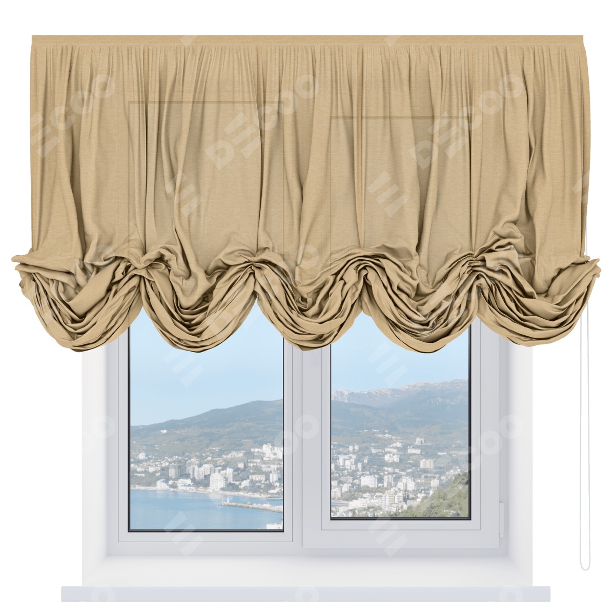 Австрийская штора производителя «Cortin», используется для проёма, пошита из ткани лён тёмно-бежевый, артикул ткани 53433. Имеет универсальный механизм и подходит для монтажа: на потолок и на стену.