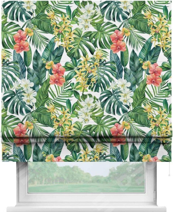 Классическая римская штора производителя «Cortin», пошита из ткани блэкаут с нанесением сублимационной печати «Орхидеи в тропиках». Имеет универсальный механизм и подходит для монтажа: на потолок, на стену и в нишу.
