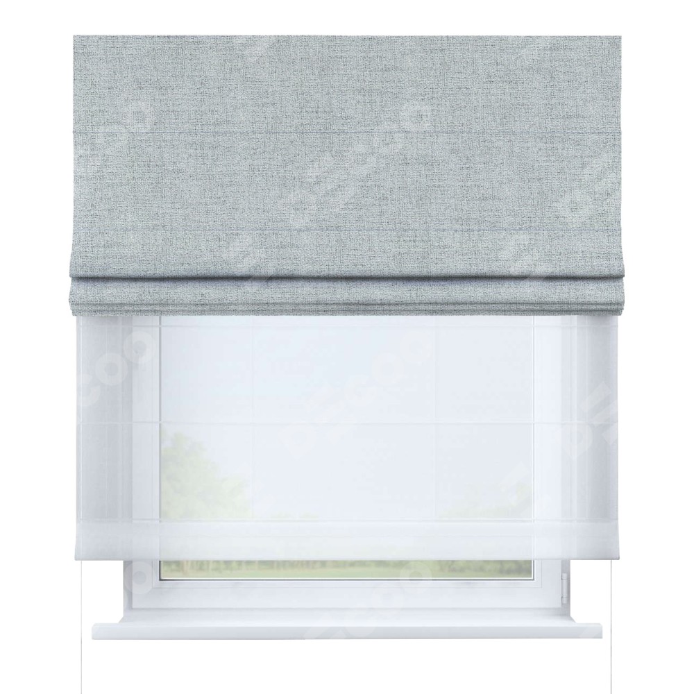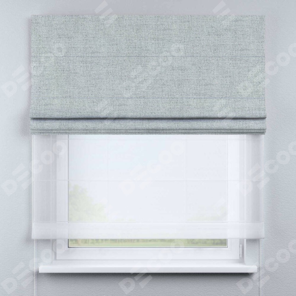 Двойная римская штора «День-ночь» от производителя Cortin предназначена для использования в проёмах. Эта штора уникальна тем, что состоит из двух полотен. На лицевой стороне находится рогожка димаут серый (артикул: 91027), обеспечивающий эффективное затемнение. В комплект также входит вторая ткань — легкий белый тюль (артикул: V-01), который добавляет изящества и легкости оформлению окна. Кроме того, доступны и другие разновидности ткани тюль, выбор которых доступен по  ссылке .