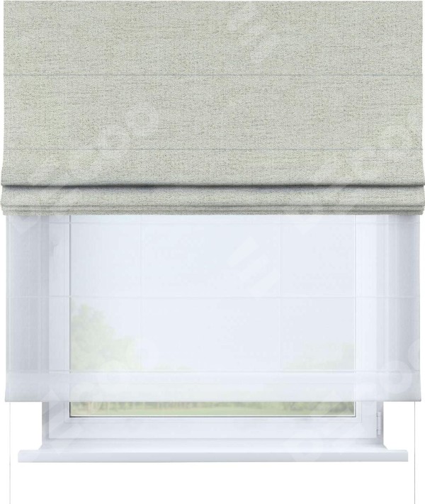 Двойная римская штора «День-ночь» от производителя Cortin предназначена для использования в проёмах. Эта штора уникальна тем, что состоит из двух полотен. На лицевой стороне находится рогожка димаут серо-бежевый (артикул: 91014), обеспечивающий эффективное затемнение. В комплект также входит вторая ткань — легкий белый тюль (артикул: V-01), который добавляет изящества и легкости оформлению окна. Кроме того, доступны и другие разновидности ткани тюль, выбор которых доступен по ссылке .