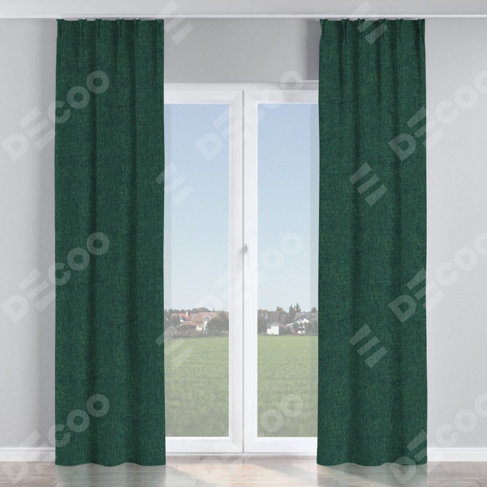 Комплект прямых штор, от производителя «Cortin», пошиты из ткани рогожка димаут тёмно-зелёный, артикул ткани 91022. С изнаночной стороны в верхней части штор пристрачивается шторная лента с декоративными складками «Кустик». Для создания элегантных складок прямые шторы шьются по стандарту с коэффициентом 1:2 (на 100 см. ширины проёма 200 см. ширины ткани).