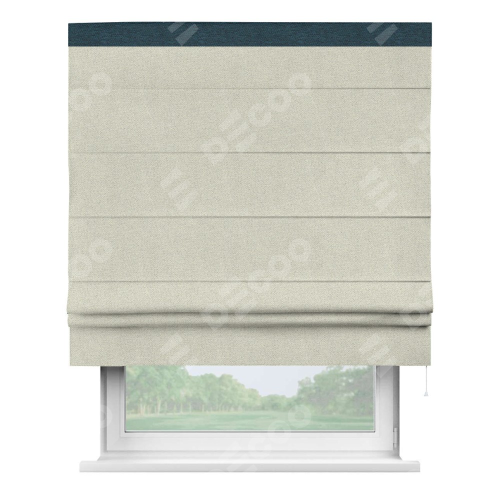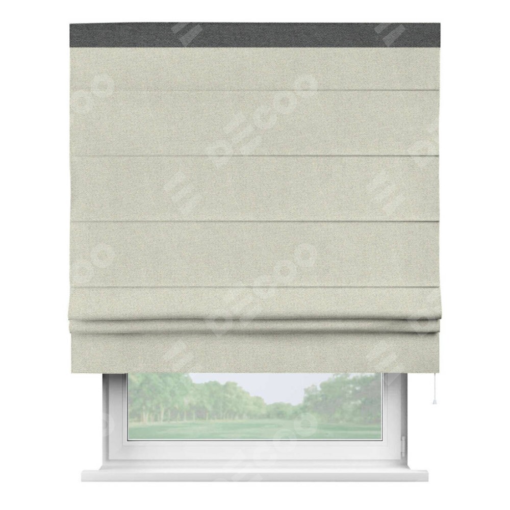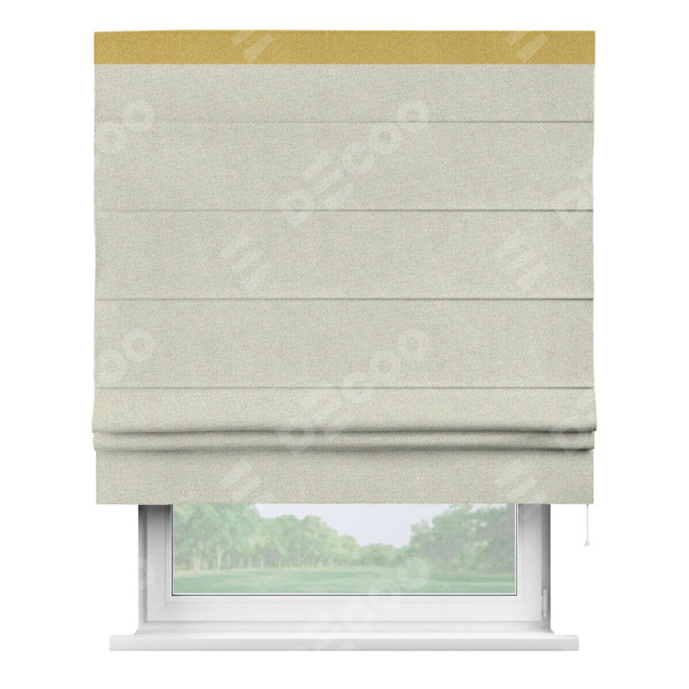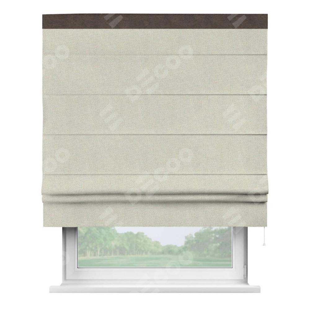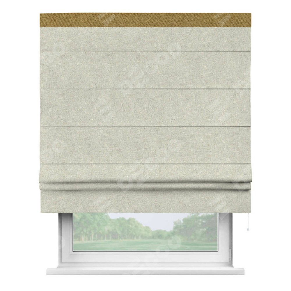 Римская штора пошита из ткани твид блэкаут шампань, артикул: 90929, с отделкой кантом «Кинг» отличается своей необычной особенностью: кант располагается исключительно сверху шторы. Такой дизайн делает акцент на верхней части окна, визуально поднимая потолок и придавая интерьеру более возвышенный и изысканный вид. Отделка кантом на верхней кромке не только украшает штору, но и может служить дополнительной защитой от износа в месте наибольшего контакта с механизмом управления шторой.