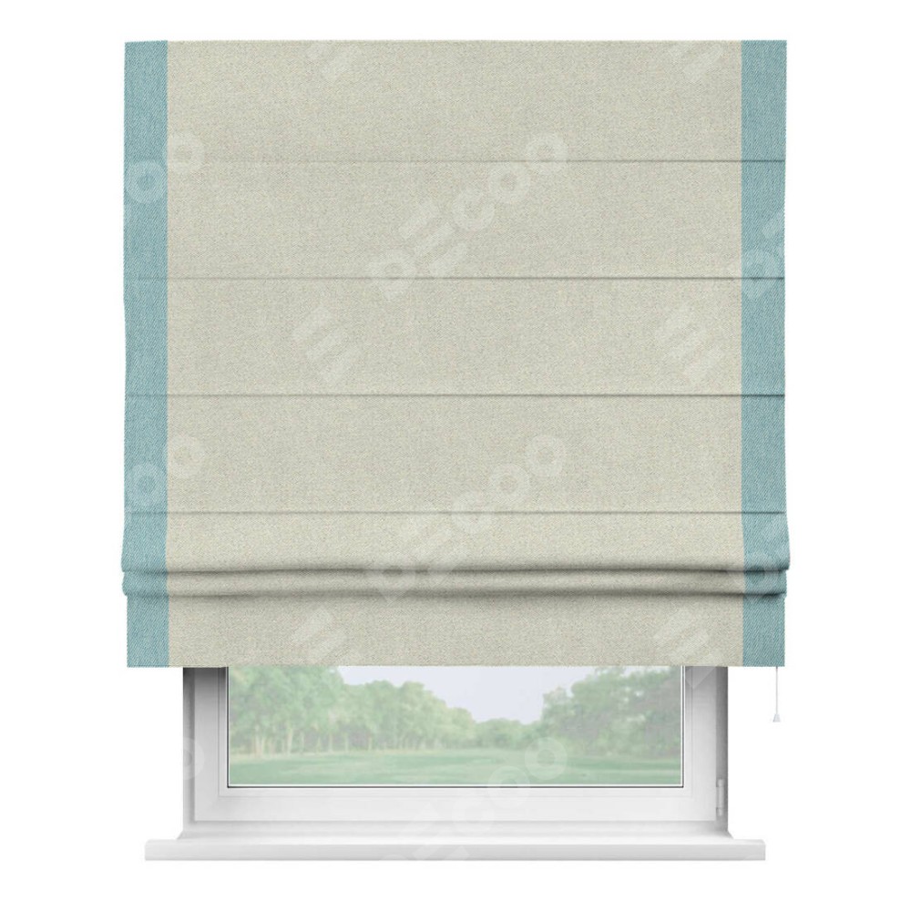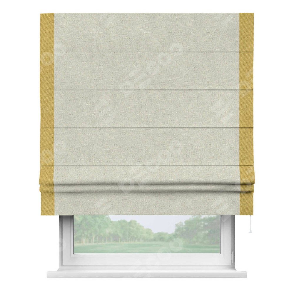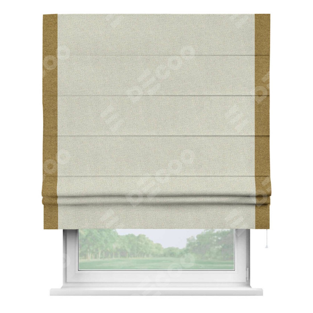 Римская штора пошита из ткани твид блэкаут шампань, артикул: 90929, с отделкой кантом «Стрим Дуо» выделяется наличием кантов по обоим бокам шторы, слева и справа. Этот дизайн придает шторе аккуратный и завершенный вид, акцентируя вертикальные линии и визуально вытягивая окно в высоту. Отделка кантом по бокам не только украшает штору, но и служит практической функцией, укрепляя края и продлевая срок службы изделия.