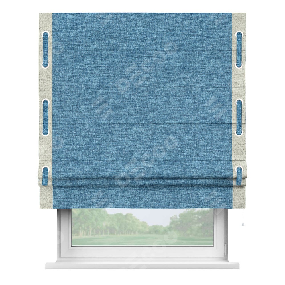 Римская штора «Кортин» для проёма, рогожка димаут джинс, с кантом Стрим Дуо (люверсы с пояском)