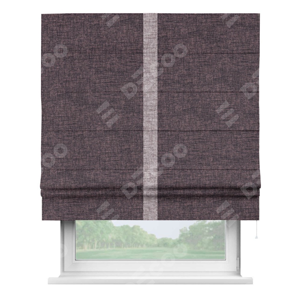 Римская штора пошита из ткани рогожка димаут розово-коричневый, артикул: 91020, с отделкой кантом «Хайвэй» представляет собой уникальное и смелое дизайнерское решение, где кант расположен вертикально посередине шторы. Этот дизайн не только выделяет штору среди других вариантов оформления окон, но и создает интересный визуальный акцент, привлекая внимание к центру окна и разделяя штору на визуальные зоны. Такой нестандартный подход добавляет динамичности интерьеру и может быть использован для подчеркивания особенностей оформления помещения.
