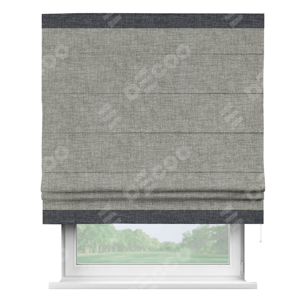 Римская штора пошита из ткани рогожка димаут серый дуб, артикул: 91028, с отделкой кантом «Горизонт» предлагает уникальное дизайнерское решение, при котором кант располагается только вверху и снизу шторы. Такое решение делает акцент на горизонтальных линиях, визуально расширяя пространство и придавая окну более строгий и организованный вид. Отделка кантом в этих ключевых местах не только украшает штору, но и способствует её долговечности, защищая наиболее уязвимые к износу края.
