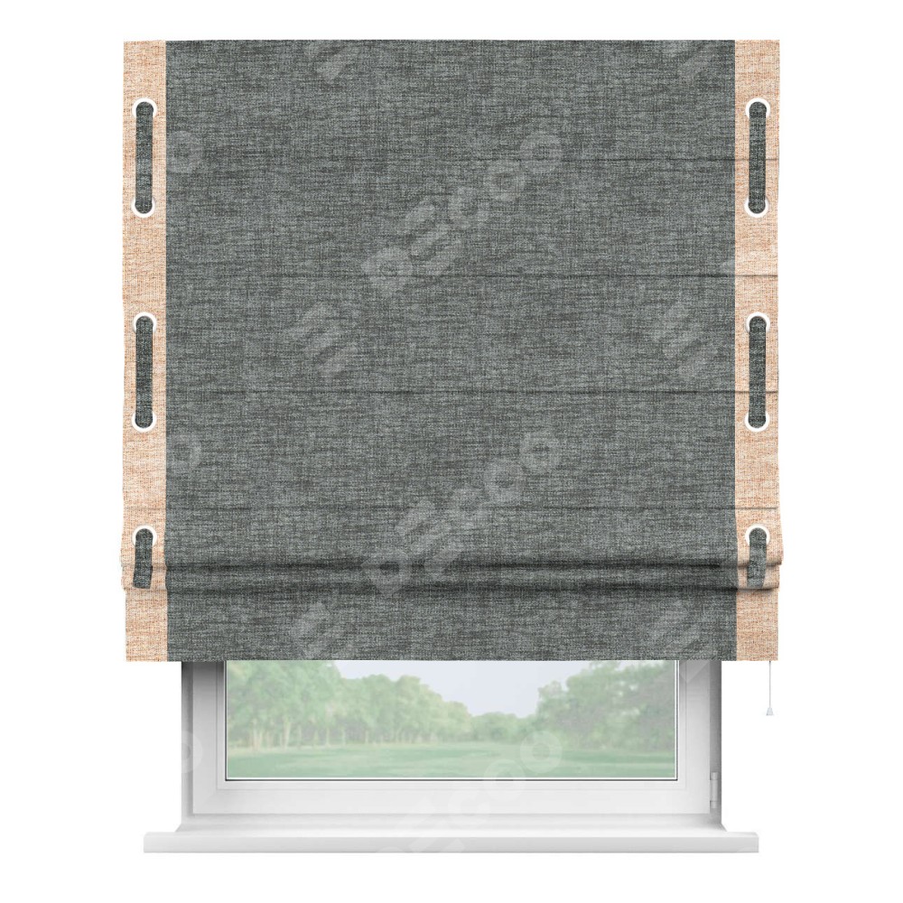Римская штора пошита из ткани рогожка димаут тёмно-серый, артикул: 91029, с отделкой кантом «Стрим Дуо», дополненная декоративными люверсами на этих кантах и протянутым пояском из основного цвета римской шторы, представляет собой высоко декоративное и функциональное решение для оконного оформления. Канты, расположенные по обеим боковым сторонам шторы, уже добавляют изысканности и завершенности внешнему виду. Добавление люверсов и пояска не только усиливает декоративный эффект, но и придает шторе дополнительную текстурность и глубину.