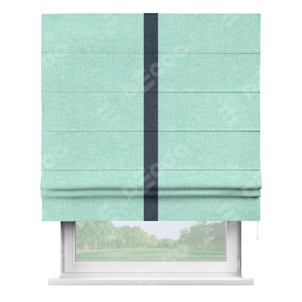 Римская штора пошита из ткани лён кашемир мятный, артикул: 21617, с отделкой кантом «Хайвэй» представляет собой уникальное и смелое дизайнерское решение, где кант расположен вертикально посередине шторы. Этот дизайн не только выделяет штору среди других вариантов оформления окон, но и создает интересный визуальный акцент, привлекая внимание к центру окна и разделяя штору на визуальные зоны. Такой нестандартный подход добавляет динамичности интерьеру и может быть использован для подчеркивания особенностей оформления помещения.