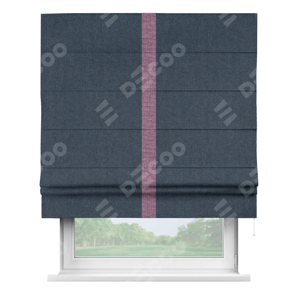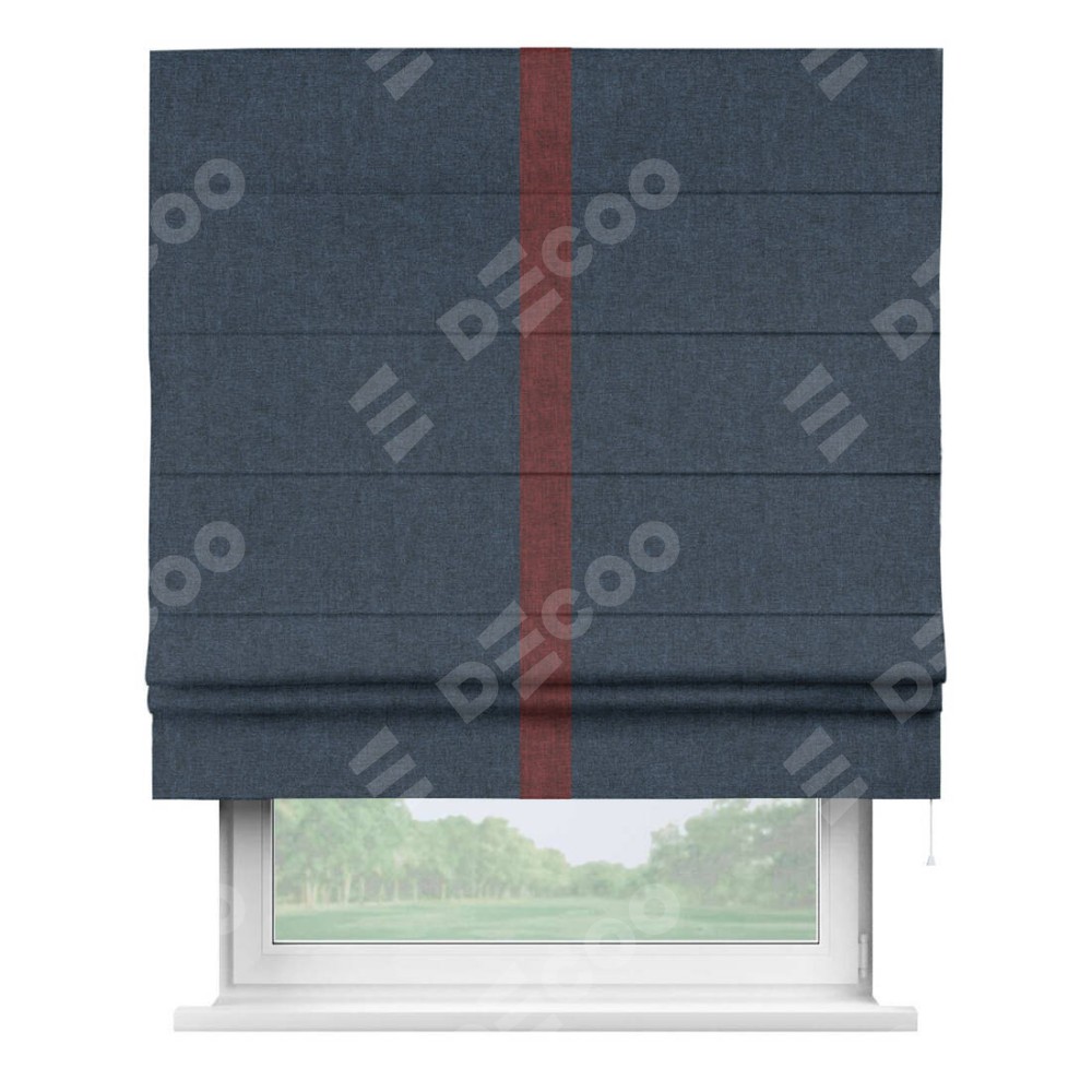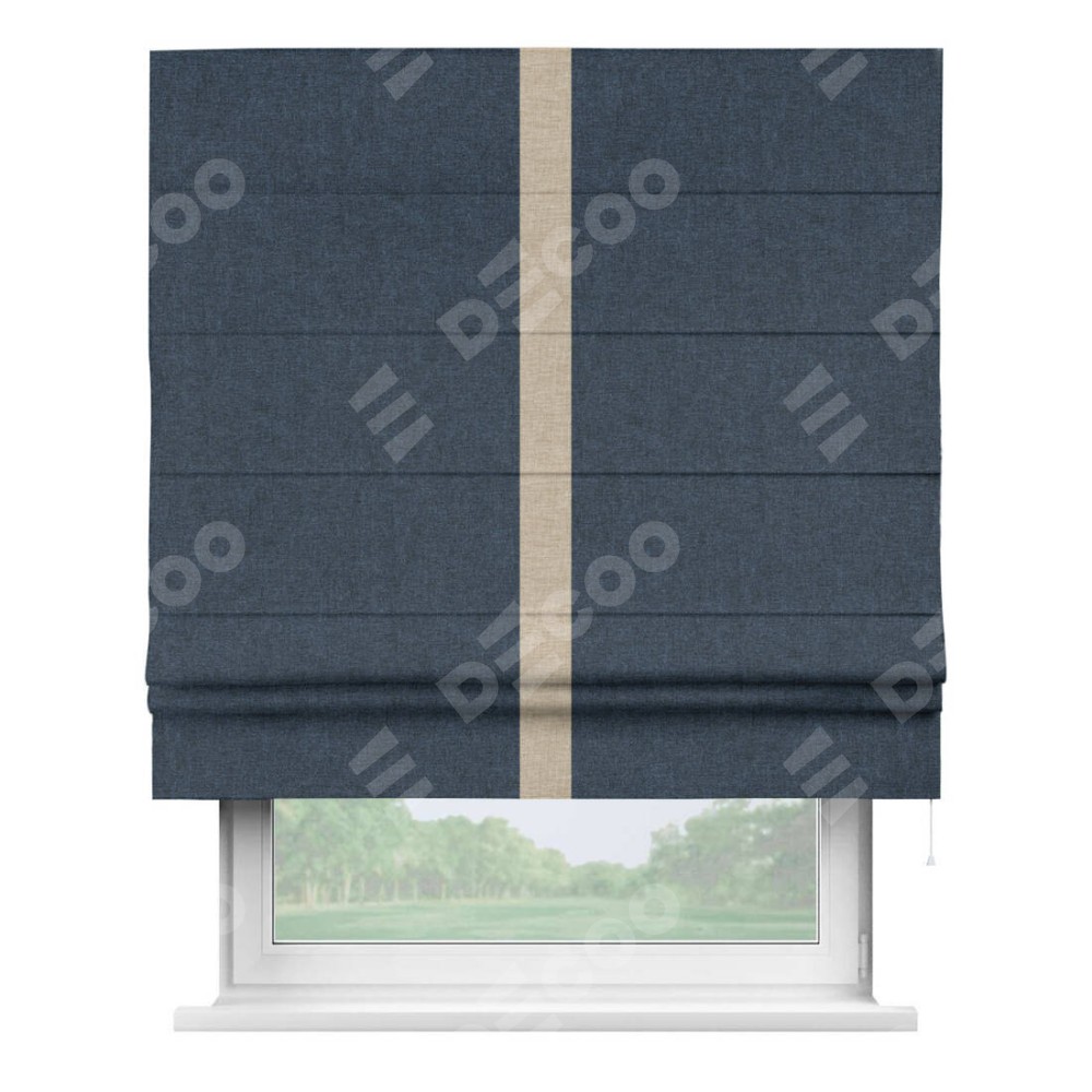 Римская штора пошита из ткани лён кашемир синий, артикул: 21623, с отделкой кантом «Хайвэй» представляет собой уникальное и смелое дизайнерское решение, где кант расположен вертикально посередине шторы. Этот дизайн не только выделяет штору среди других вариантов оформления окон, но и создает интересный визуальный акцент, привлекая внимание к центру окна и разделяя штору на визуальные зоны. Такой нестандартный подход добавляет динамичности интерьеру и может быть использован для подчеркивания особенностей оформления помещения.