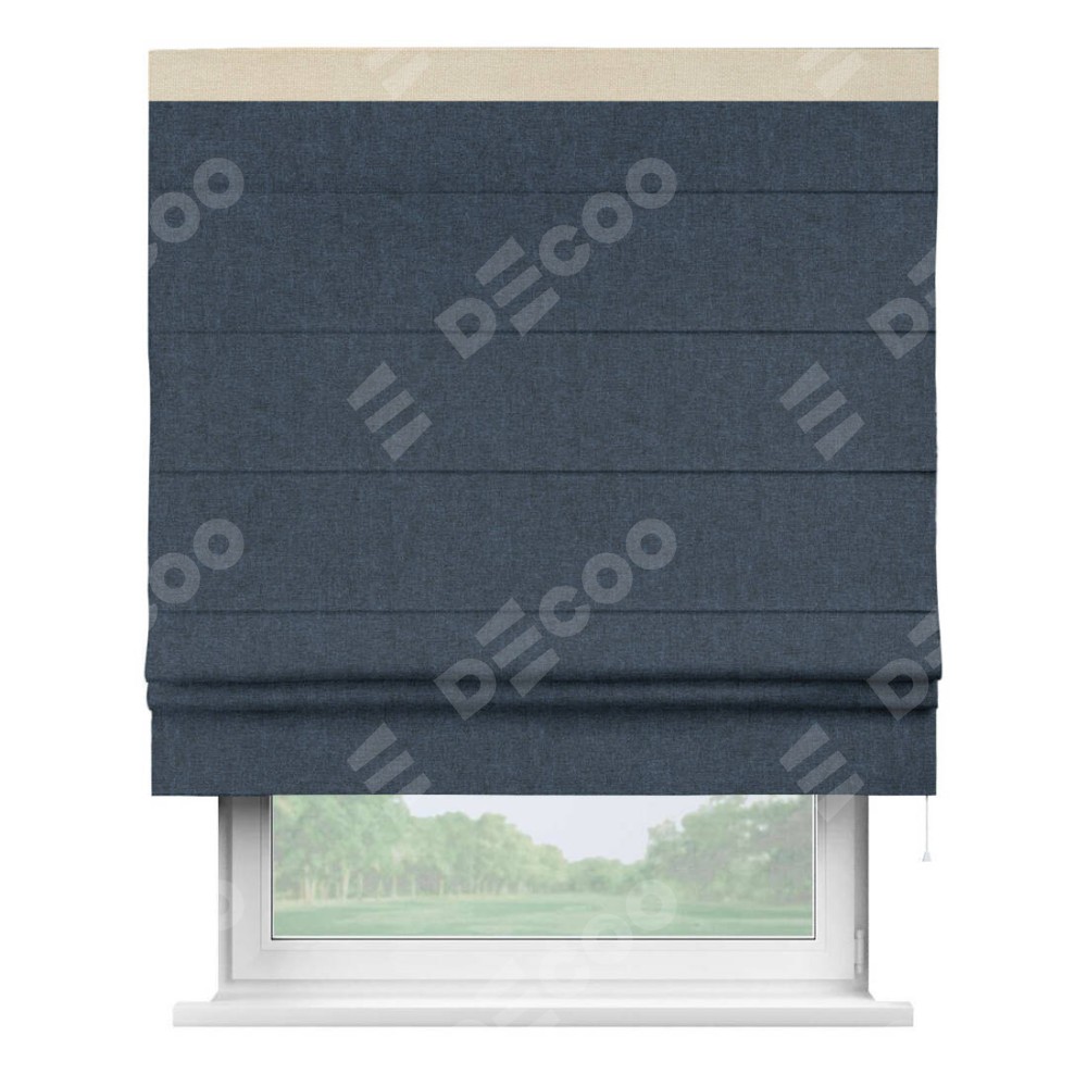 Римская штора пошита из ткани лён кашемир синий, артикул: 21623, с отделкой кантом «Кинг» отличается своей необычной особенностью: кант располагается исключительно сверху шторы. Такой дизайн делает акцент на верхней части окна, визуально поднимая потолок и придавая интерьеру более возвышенный и изысканный вид. Отделка кантом на верхней кромке не только украшает штору, но и может служить дополнительной защитой от износа в месте наибольшего контакта с механизмом управления шторой.
