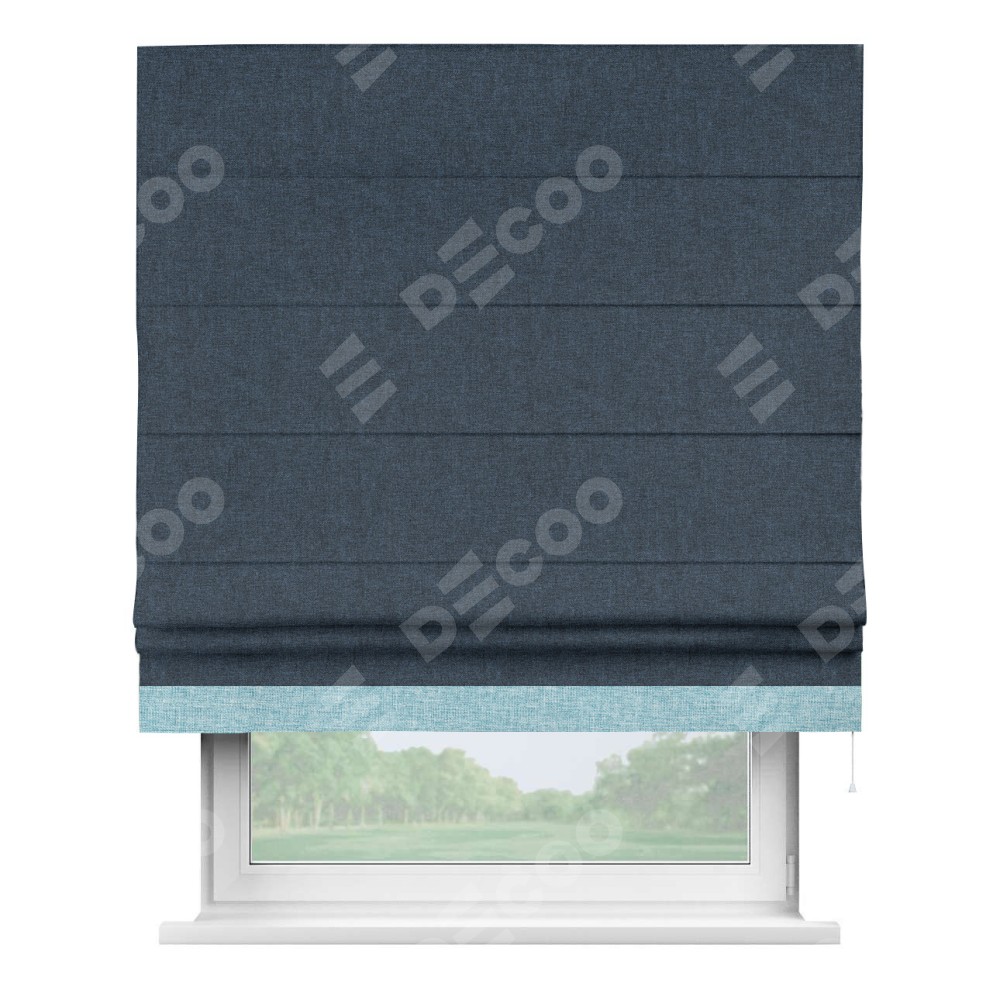 Римская штора пошита из ткани лён кашемир синий, артикул: 21623, с отделкой кантом «Джестер» выделяется своей уникальной особенностью — кантом, расположенным только снизу шторы. Этот дизайн добавляет оригинальности и игривости оконному оформлению, делая акцент на нижней части шторы и создавая интересный визуальный эффект. Отделка кантом на нижнем крае не только служит эстетической функции, но и способствует увеличению прочности и износостойкости ткани в этом месте.