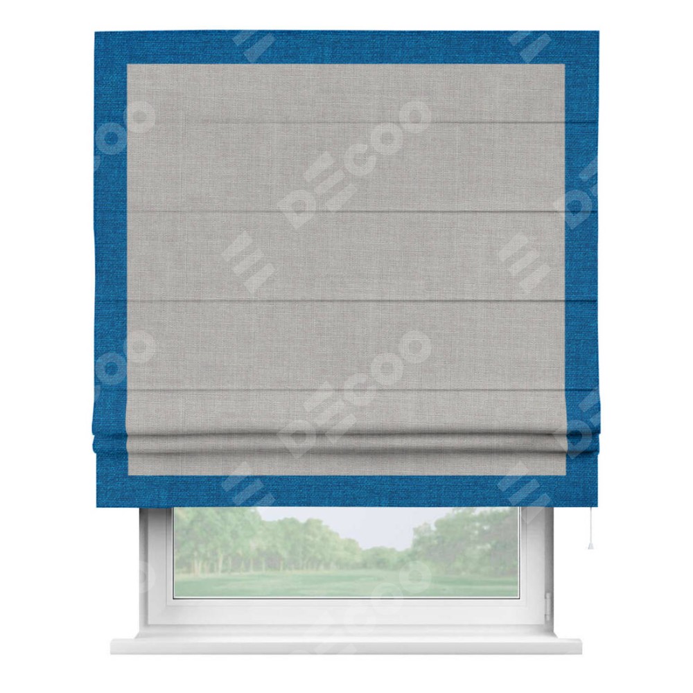 Римская штора пошита из ткани лён серый, артикул: 91410, с отделкой кантом «Чесс» отличается своей уникальной деталью — наличием канта не только по бокам и снизу, но и сверху по всем краям шторы. Это придает шторе особенно аккуратный и завершенный вид, делая акцент на границах и форме шторы. Отделка кантом по всему периметру шторы усиливает её декоративные качества и подчеркивает строгую геометрию, что может быть особенно актуально для современных и минималистичных интерьеров.