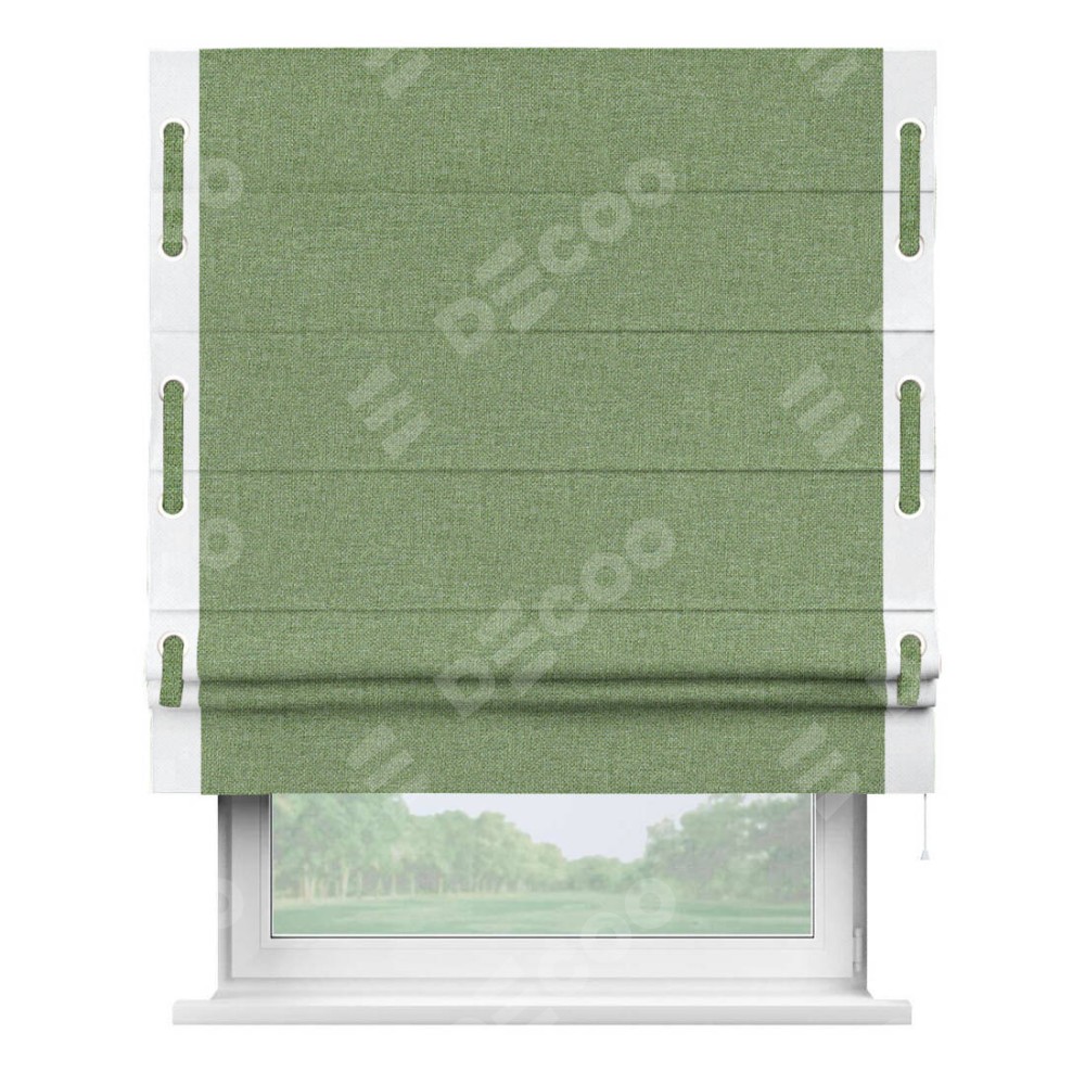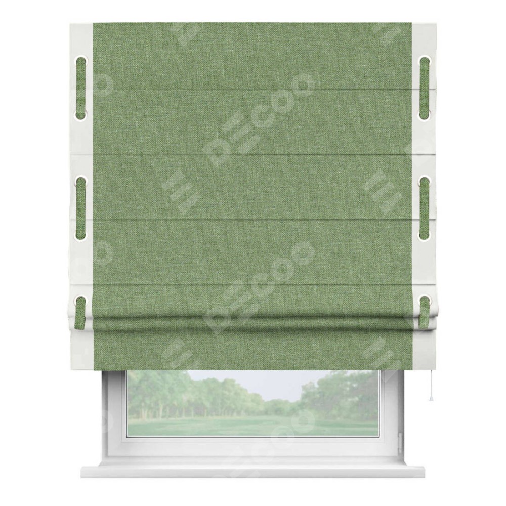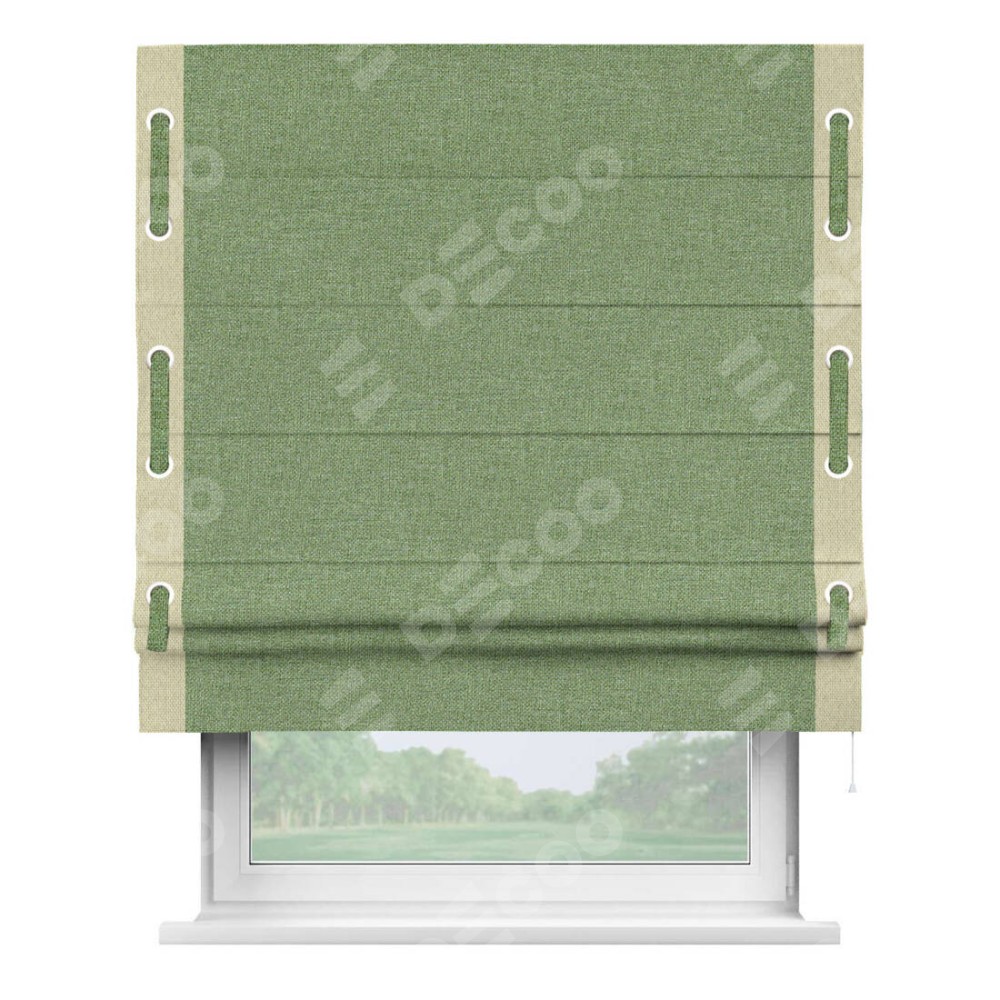 Римская штора «Cortin» для проёма, лён димаут светло-салатовый с кантом Стрим Дуо (люверсы с пояском)