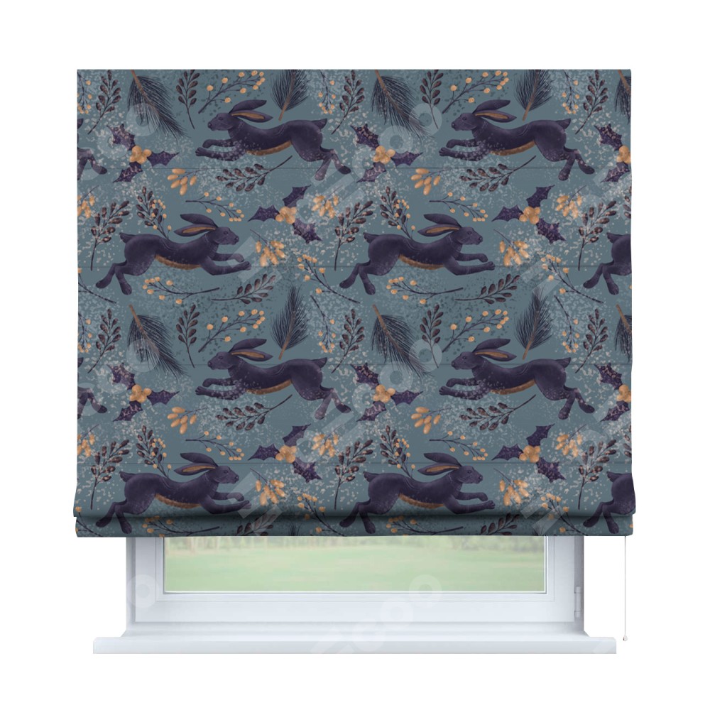 Классическая римская штора производителя «Cortin», пошита из ткани дарк арт зайцы, артикул:. Имеет универсальный механизм и подходит для монтажа: на потолок, на стену и в нишу.