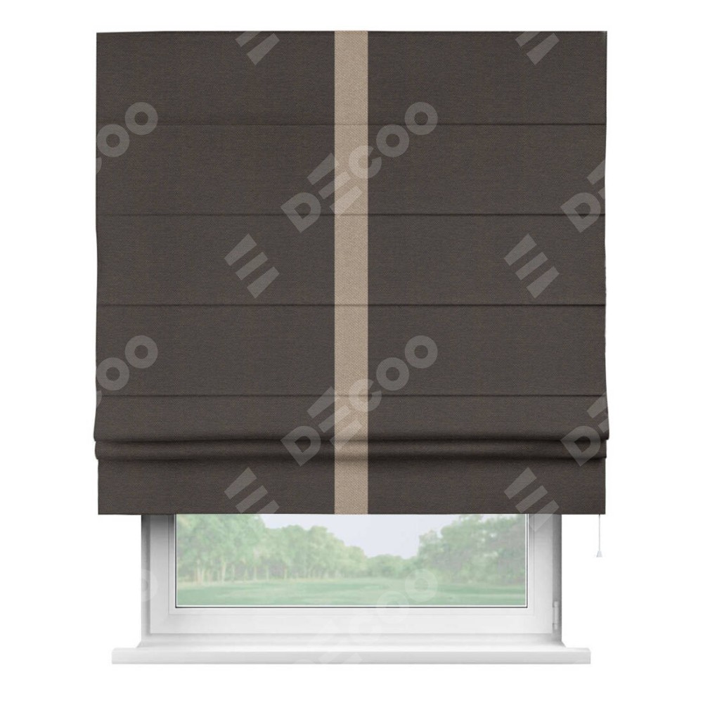 Римская штора производителя «Cortin», используется для проёма, пошита из ткани лён димаут венге, артикул 85410. Отделка шторы кантом «Хайвэй», ткань для канта используется из льна димаут разной расцветки на выбор. Имеет универсальный механизм и подходит для монтажа: на потолок, на стену и в нишу.