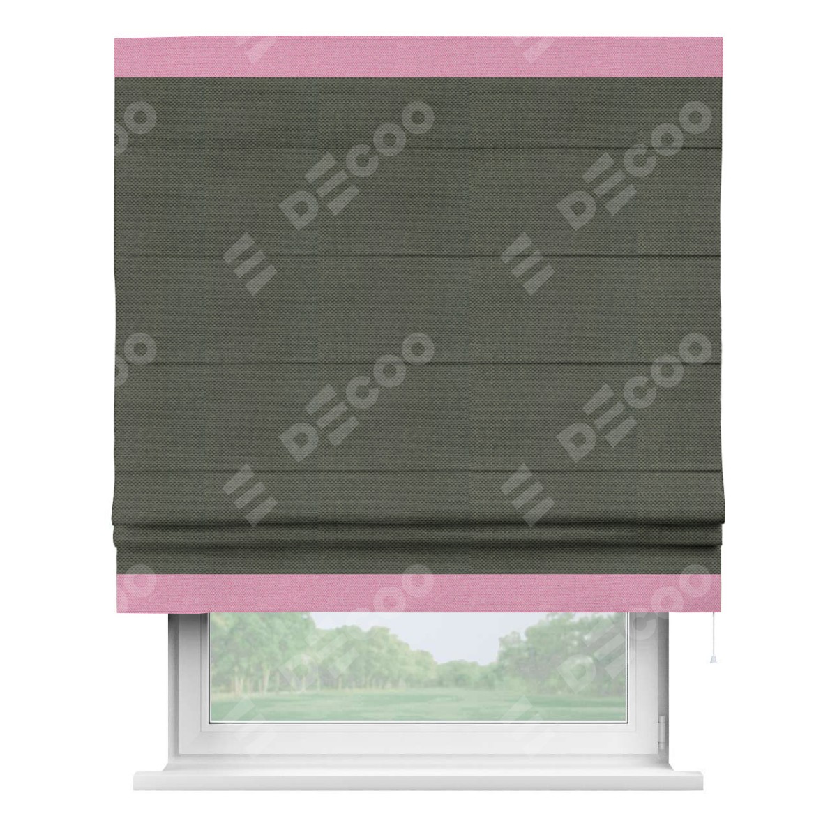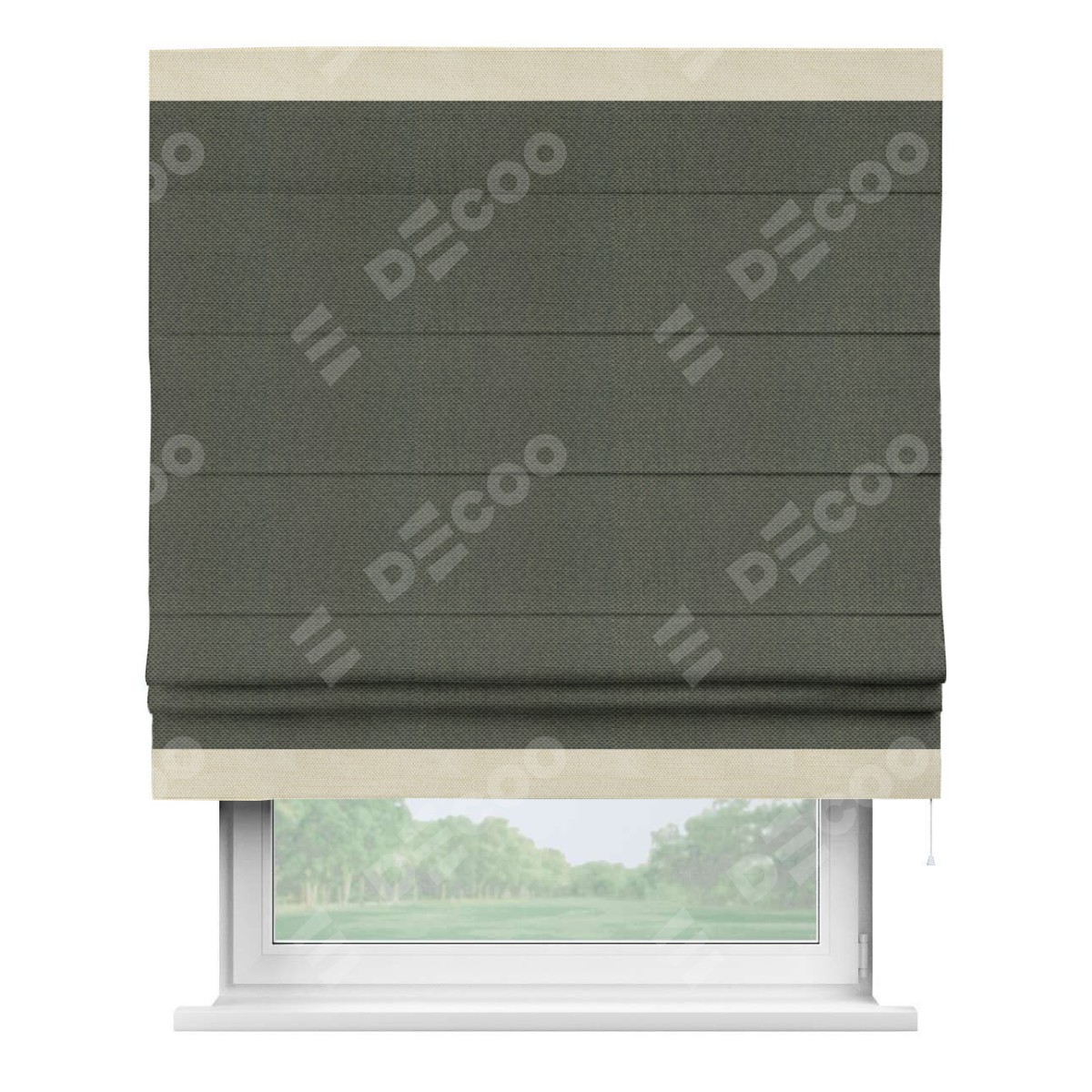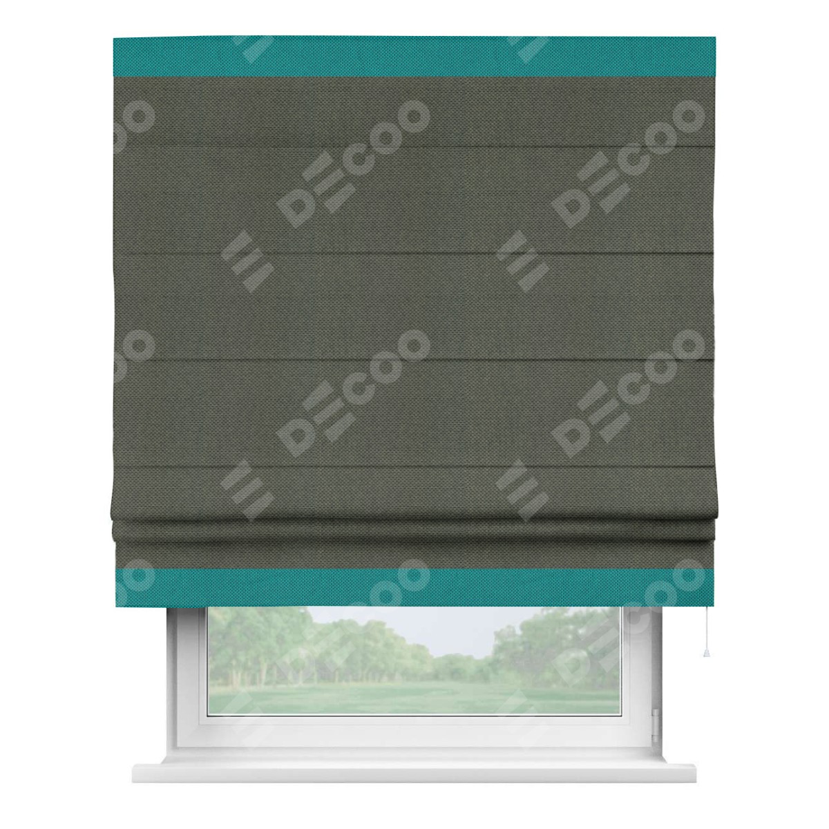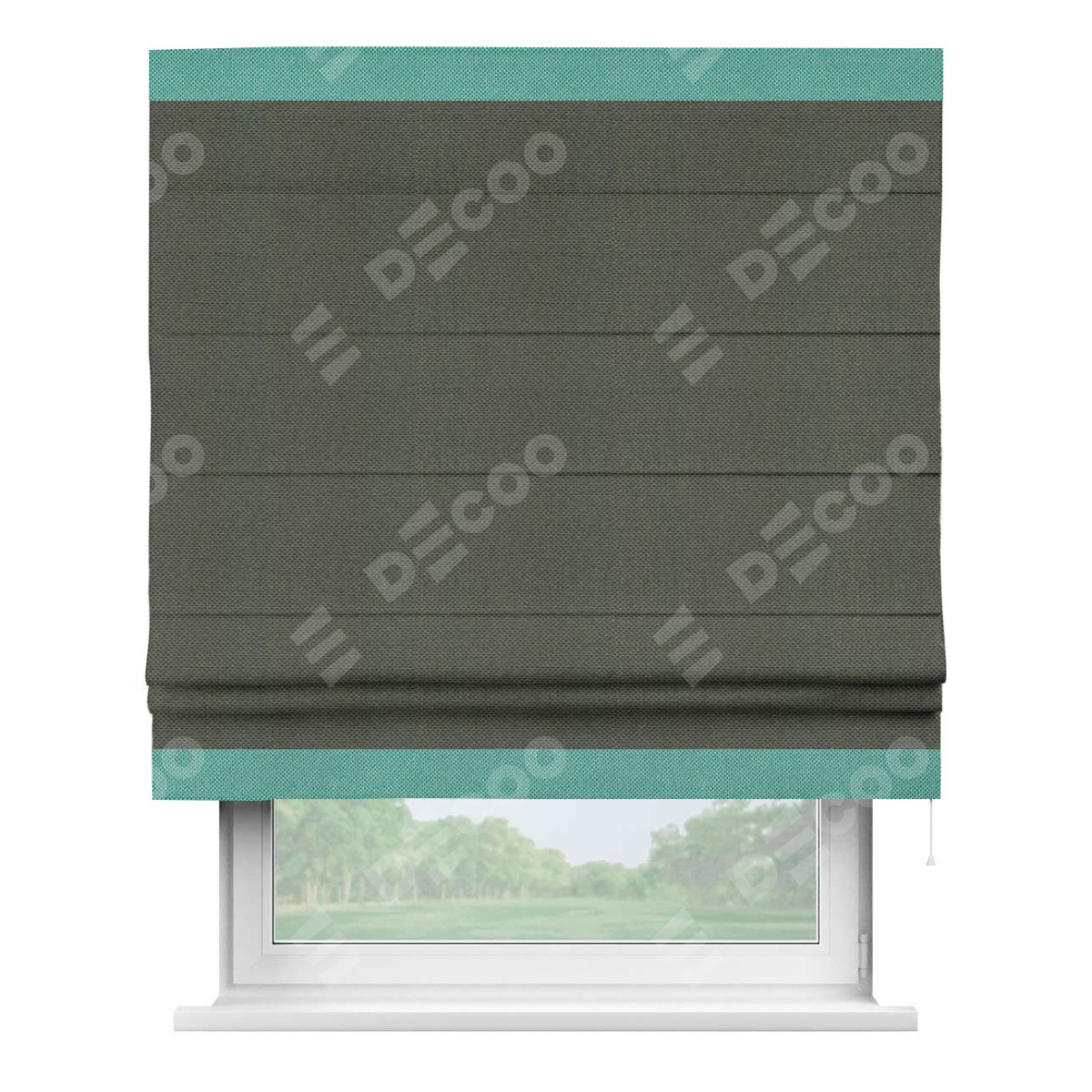 Римская штора производителя «Cortin», используется для проёма, пошита из ткани лён димаут графит, артикул 27. Отделка шторы кантом «Горизонт», ткань для канта используется из льна димаут разной расцветки на выбор. Имеет универсальный механизм и подходит для монтажа: на потолок, на стену и в нишу.