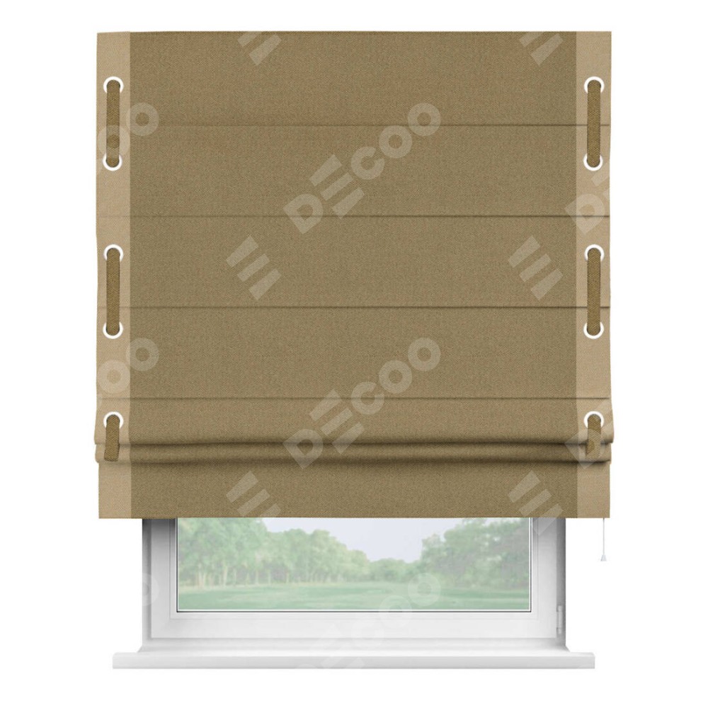 Римская штора производителя «Cortin», используется для проёма, пошита из ткани лён димаут оливковый, артикул 16243. Отделка шторы кантом «Стрим Дуо» на кантах расположены люверсы с пояском, ткань для канта используется лён димаут разной расцветки на выбор. Ткань для пояска обычно используется из основной ткани шторы, а так же можно сделать из любой расцветки по желанию. Имеет универсальный механизм и подходит для монтажа: на потолок, на стену и в нишу.