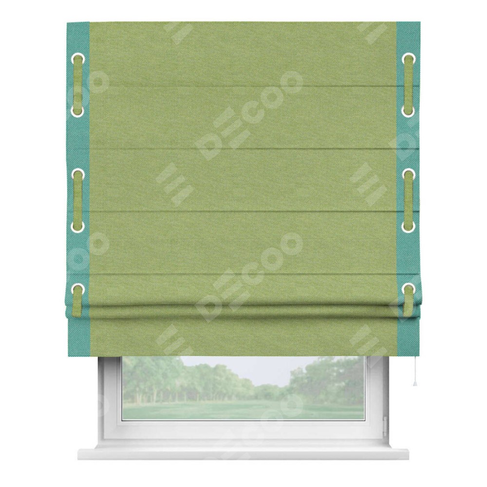 Римская штора производителя «Cortin», используется для проёма, пошита из ткани лён димаут салатовый, артикул 83032. Отделка шторы кантом «Стрим Дуо» на кантах расположены люверсы с пояском, ткань для канта используется лён димаут разной расцветки на выбор. Ткань для пояска обычно используется из основной ткани шторы, а так же можно сделать из любой расцветки по желанию. Имеет универсальный механизм и подходит для монтажа: на потолок, на стену и в нишу.