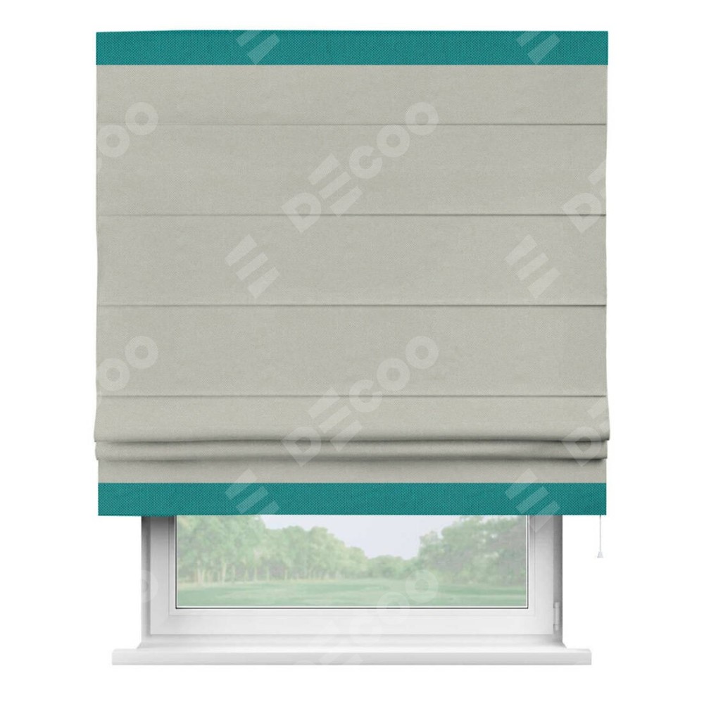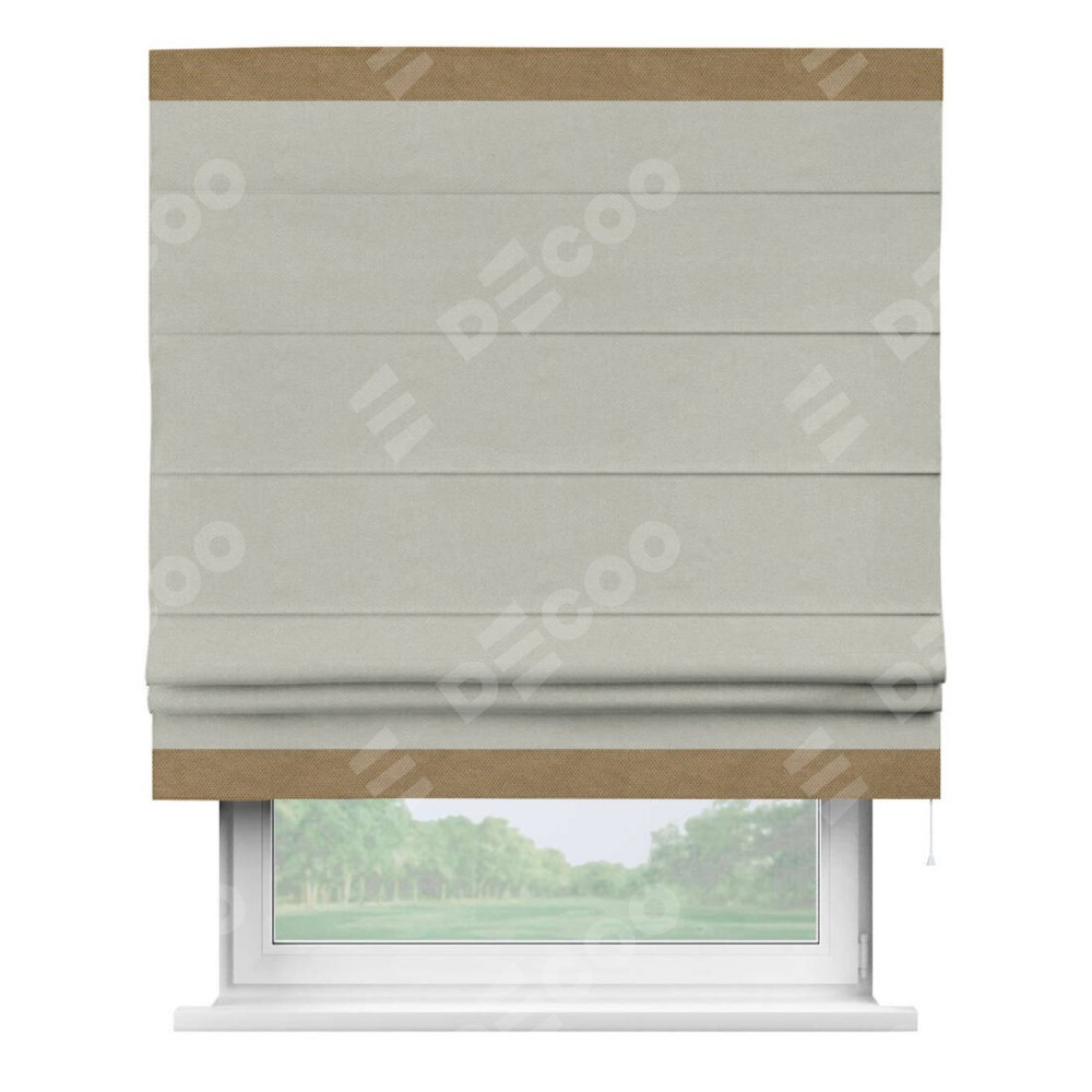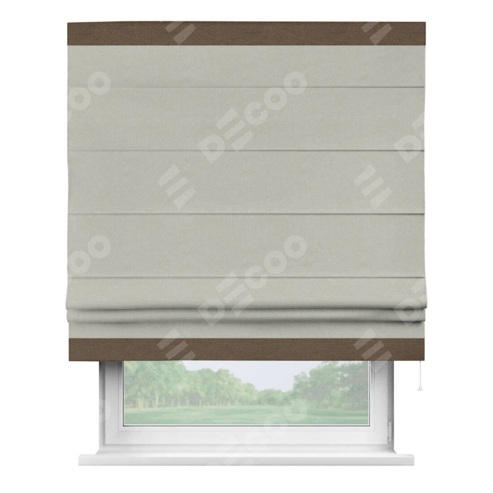 Римская штора производителя «Cortin», используется для проёма, пошита из ткани лён димаут светло-серый, артикул 83025. Отделка шторы кантом «Горизонт», ткань для канта используется из льна димаут разной расцветки на выбор. Имеет универсальный механизм и подходит для монтажа: на потолок, на стену и в нишу.