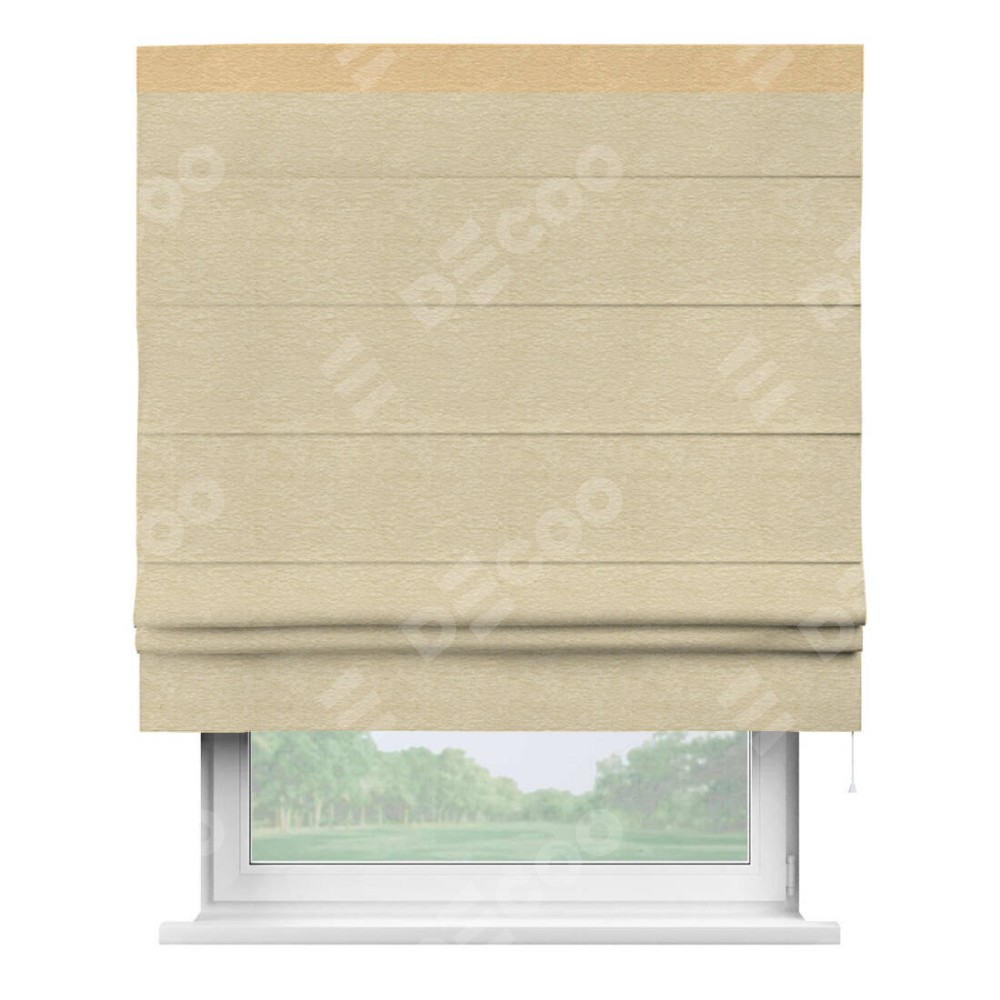 Римская штора производителя «Cortin», используется для проёма, пошита из ткани софт однотонный светло-бежевый, артикул 54426. Отделка шторы кантом «Кинг», ткань для канта используется из софта разной расцветки на выбор. Имеет универсальный механизм и подходит для монтажа: на потолок, на стену и в нишу.
