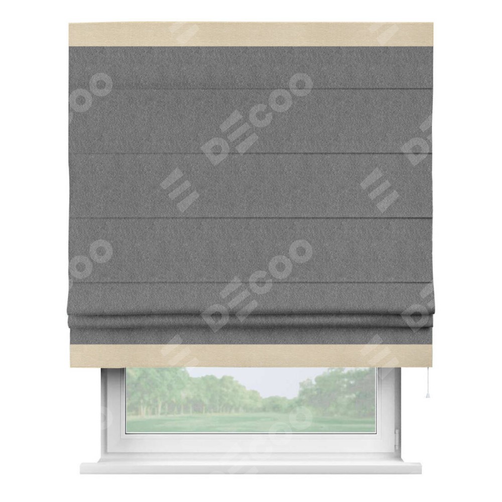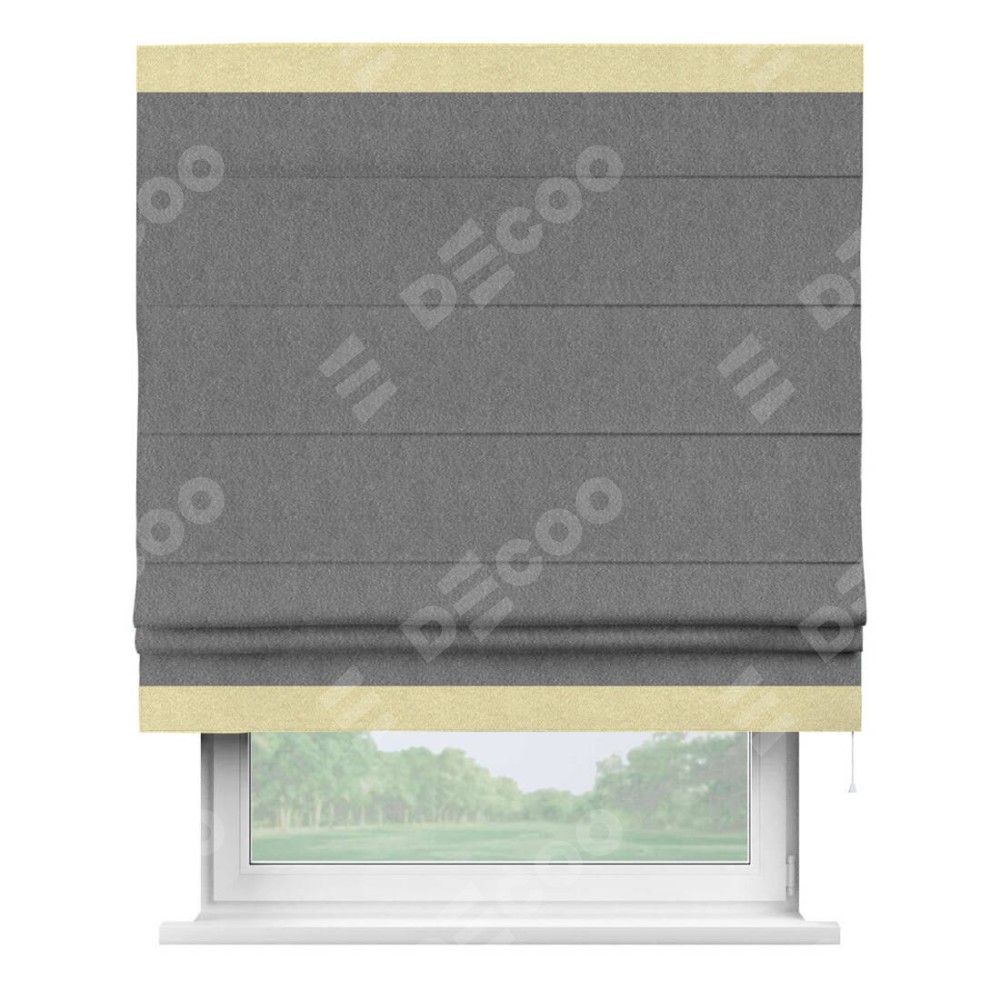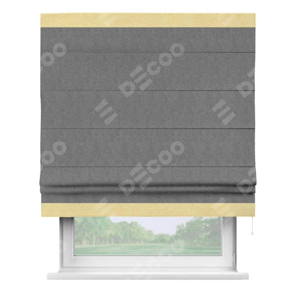 Римская штора производителя «Cortin», используется для проёма, пошита из ткани софт однотонный серый, артикул 70605. Отделка шторы кантом «Горизонт», ткань для канта используется из софта разной расцветки на выбор. Имеет универсальный механизм и подходит для монтажа: на потолок, на стену и в нишу.