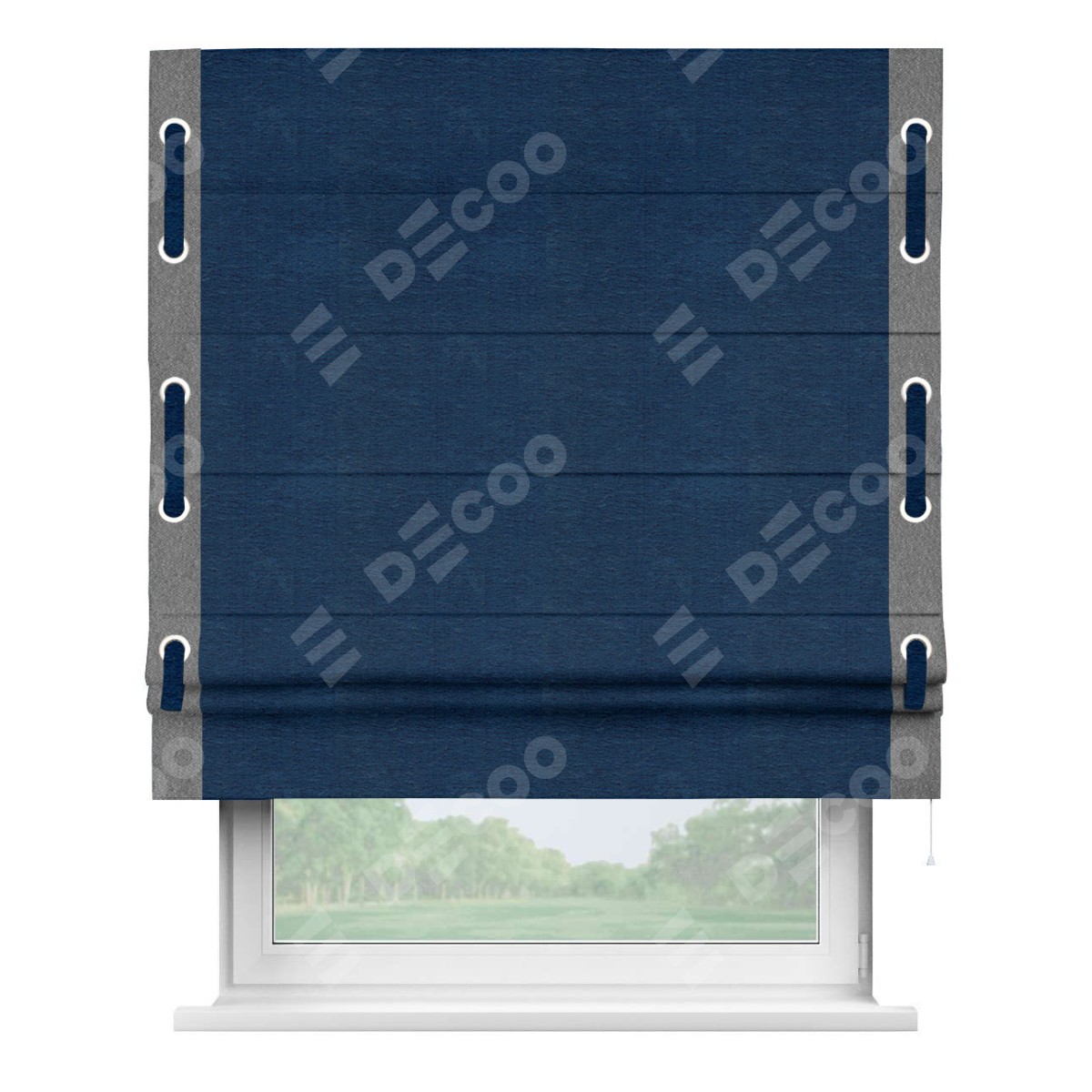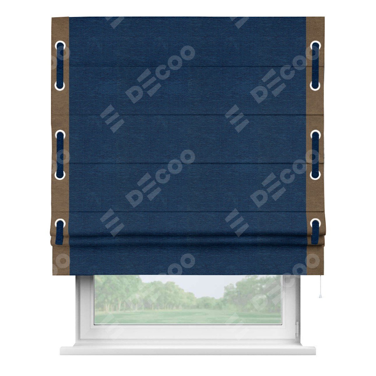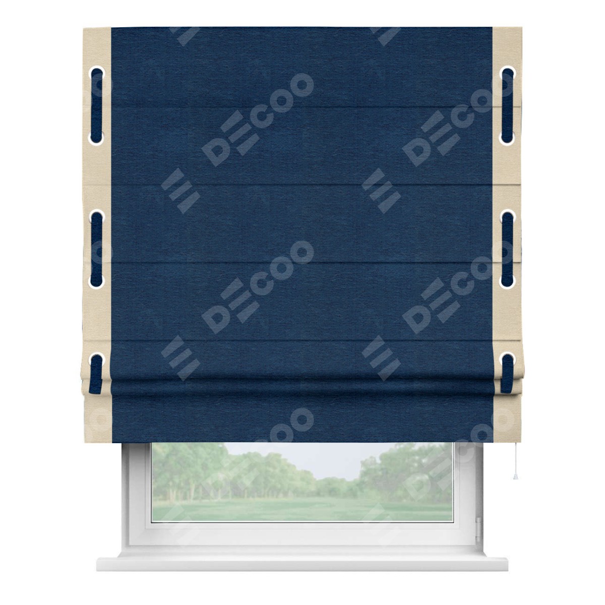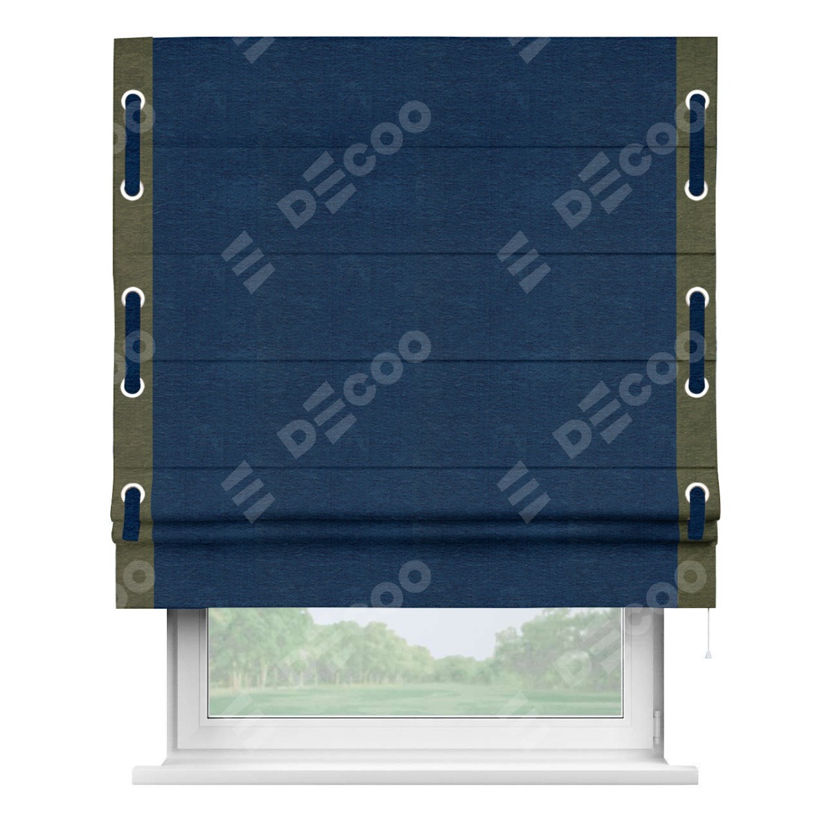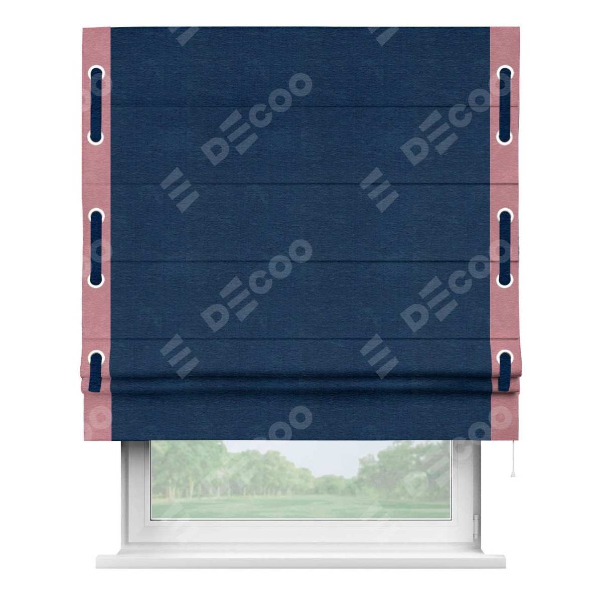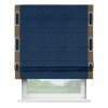 Римская штора производителя «Cortin», используется для проёма, пошита из ткани софт однотонный синий, артикул 42937. Отделка шторы кантом «Стрим Дуо» на кантах расположены люверсы с пояском, ткань для канта используется из софта разной расцветки на выбор. Ткань для пояска обычно используется из основной ткани шторы, а так же можно сделать из любой расцветки по желанию. Имеет универсальный механизм и подходит для монтажа: на потолок, на стену и в нишу.