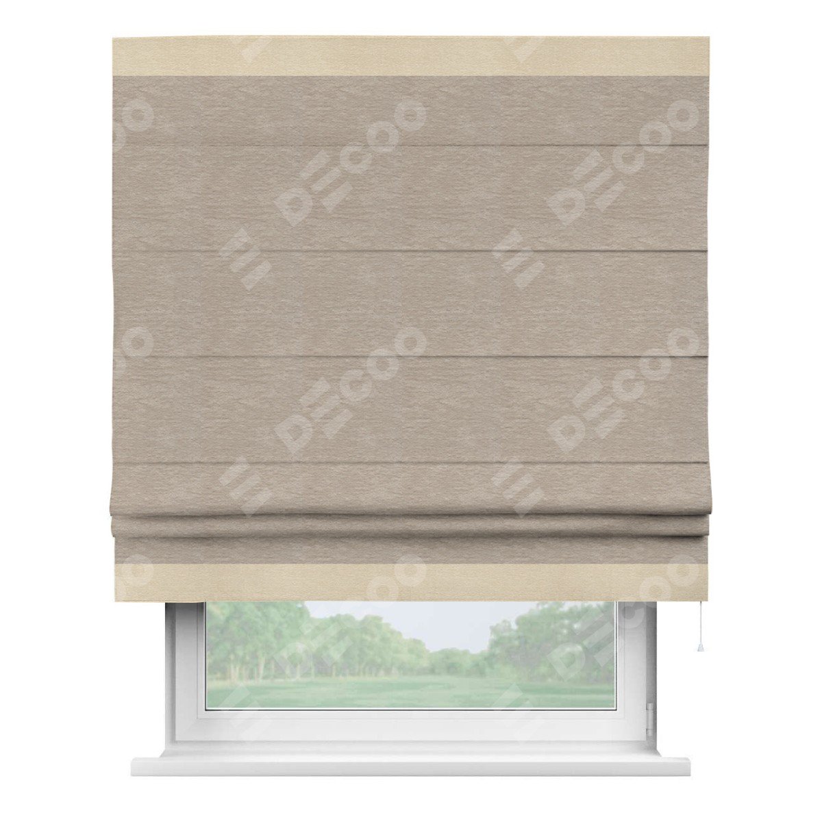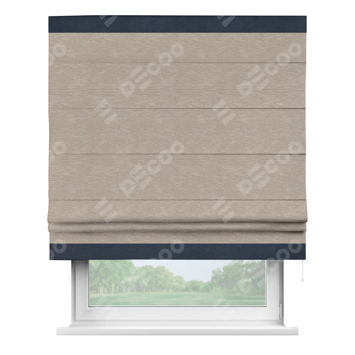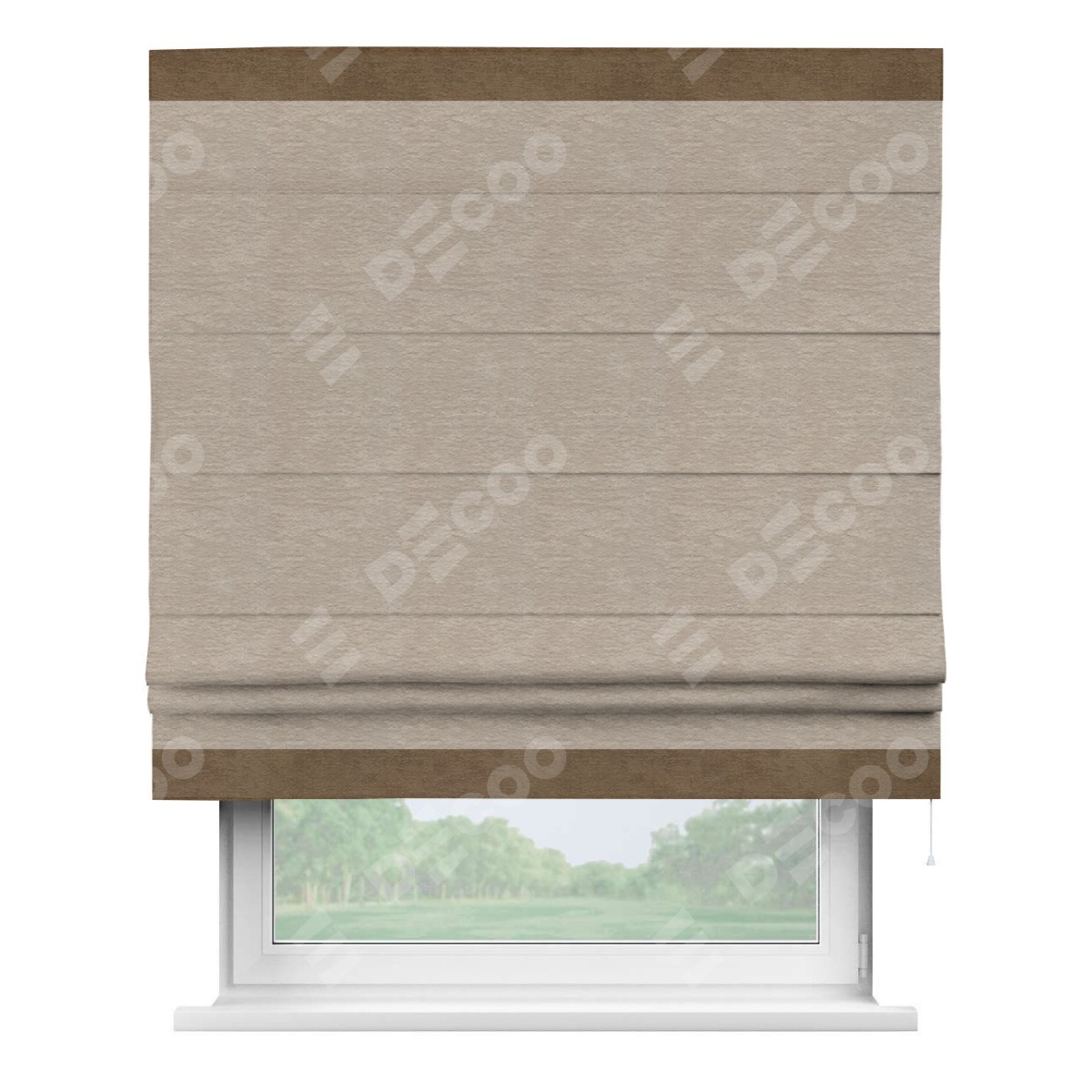 Римская штора производителя «Cortin», используется для проёма, пошита из ткани софт однотонный темно-бежевый, артикул 1640. Отделка шторы кантом «Горизонт», ткань для канта используется из софта разной расцветки на выбор. Имеет универсальный механизм и подходит для монтажа: на потолок, на стену и в нишу.