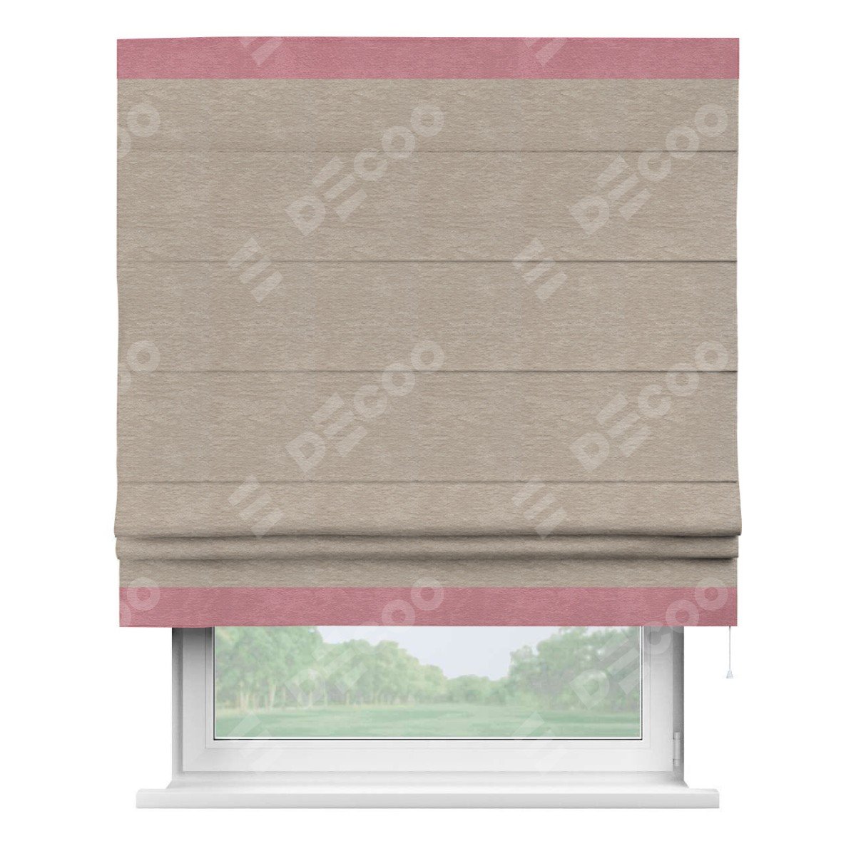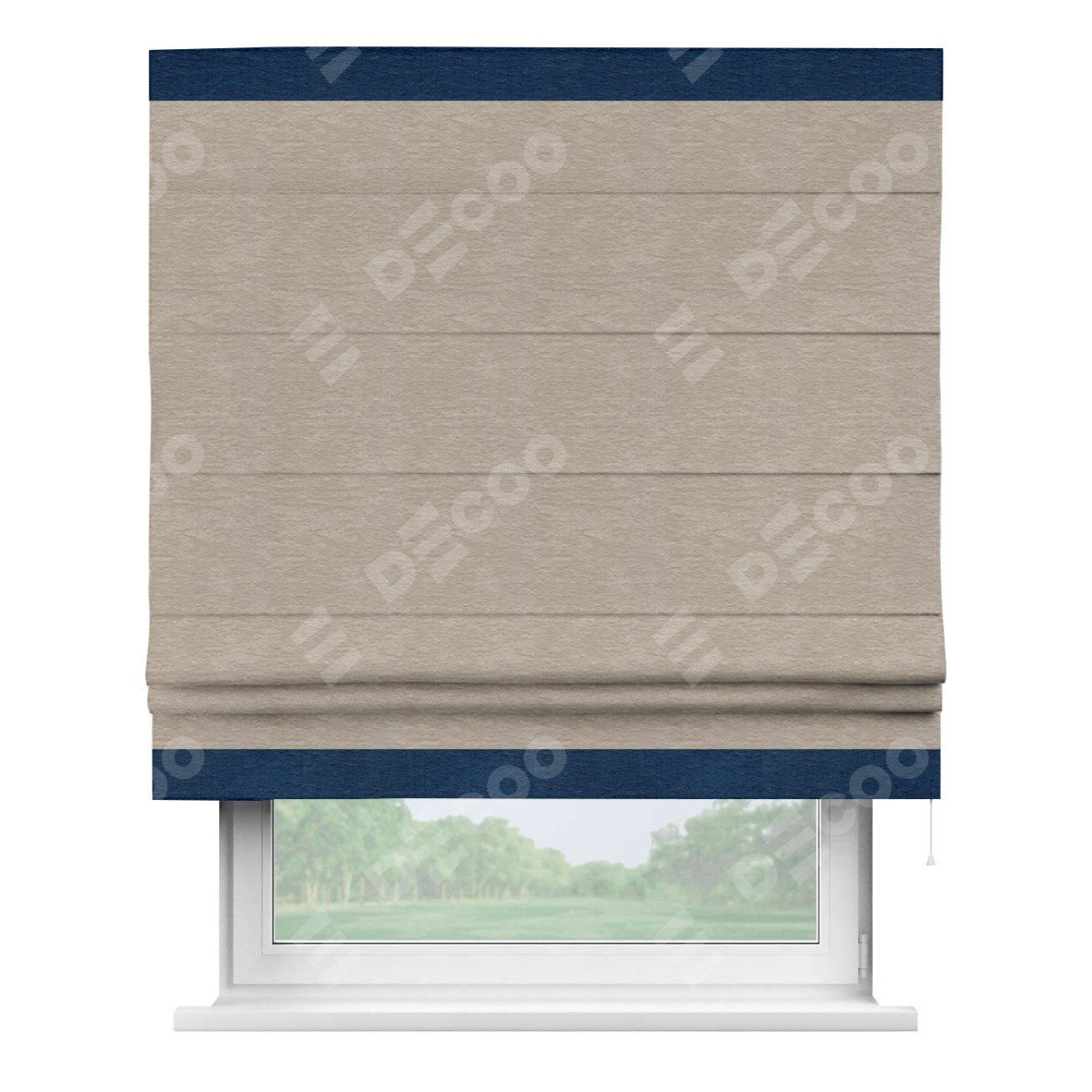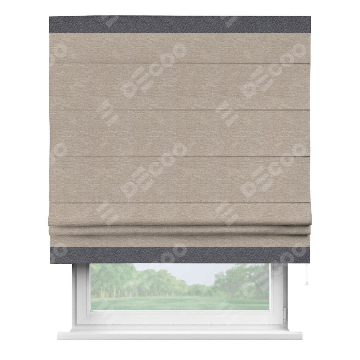 Римская штора производителя «Cortin», используется для проёма, пошита из ткани софт однотонный темно-бежевый, артикул 1640. Отделка шторы кантом «Горизонт», ткань для канта используется из софта разной расцветки на выбор. Имеет универсальный механизм и подходит для монтажа: на потолок, на стену и в нишу.