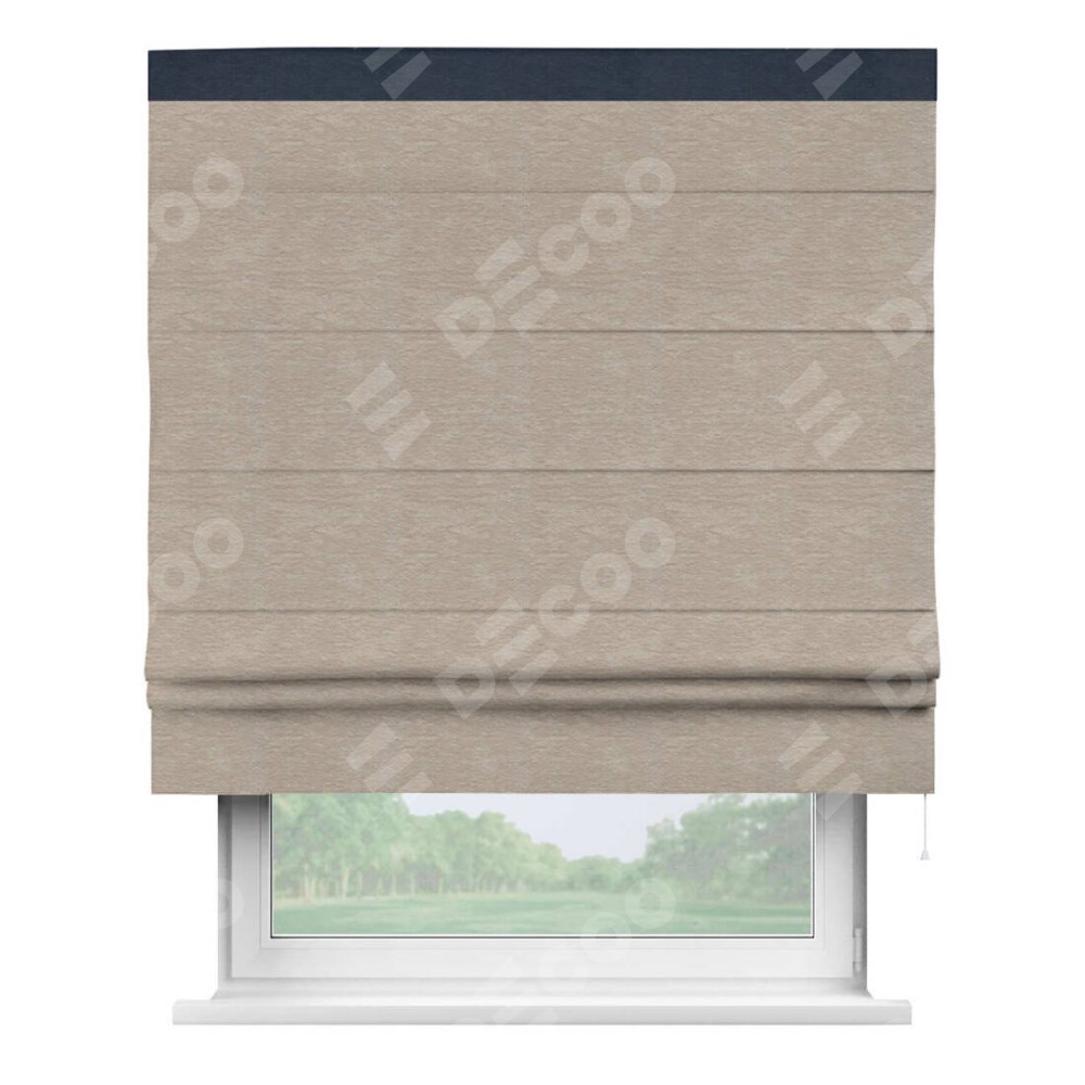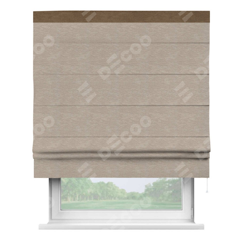 Римская штора производителя «Cortin», используется для проёма, пошита из ткани софт однотонный темно-бежевый, артикул 1640. Отделка шторы кантом «Кинг», ткань для канта используется из софта разной расцветки на выбор. Имеет универсальный механизм и подходит для монтажа: на потолок, на стену и в нишу.
