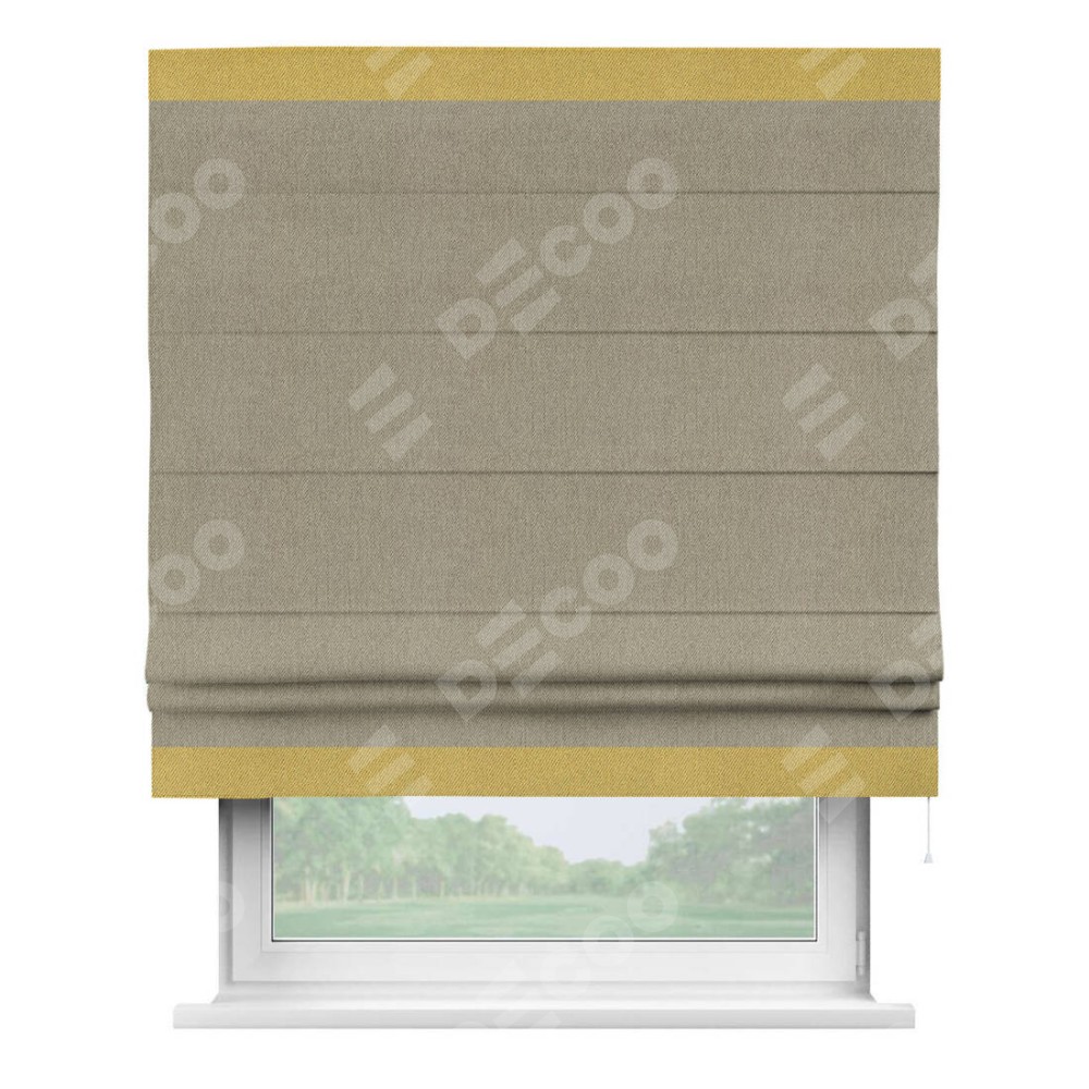 Римская штора производителя «Cortin», используется для проёма, пошита из ткани твид блэкаут кофе, артикул 21575. Отделка шторы кантом «Горизонт», ткань для канта используется из твида разной расцветки на выбор. Имеет универсальный механизм и подходит для монтажа: на потолок, на стену и в нишу.