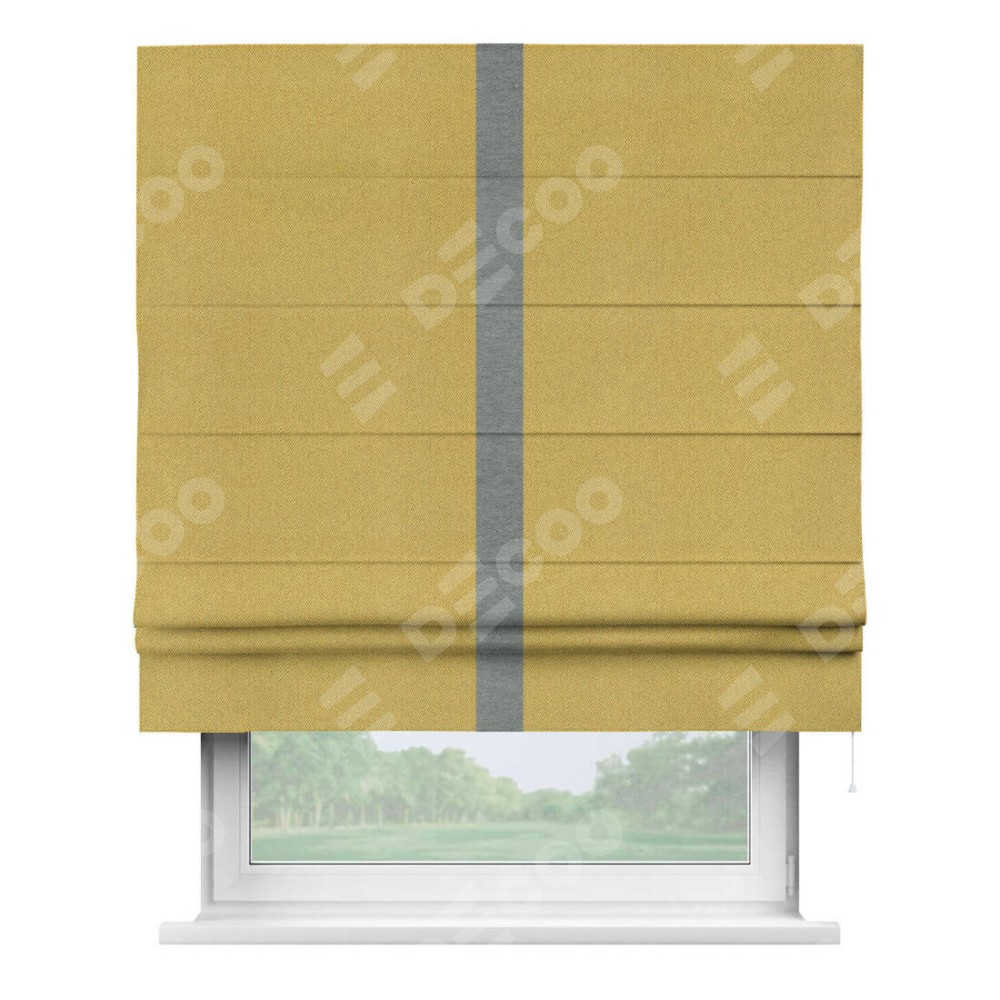 Римская штора производителя «Cortin», используется для проёма, пошита из ткани твид блэкаут пыльная горчица, артикул 21588. Отделка шторы кантом «Хайвэй», ткань для канта используется из твида разной расцветки на выбор. Имеет универсальный механизм и подходит для монтажа: на потолок, на стену и в нишу.