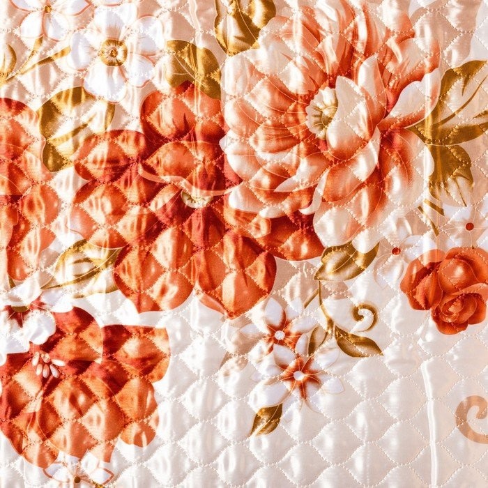 Характеристики: Ткань искусственный шелк, плотность 107 гр/м2, активное (стойкое) крашение. Верх покрывала — набивной рисунок в виде панно, низ — однотонная ткань. Края обработаны шелковой бейкой, упаковка прозрачный чемодан ПВХ с большим вкладышем.
