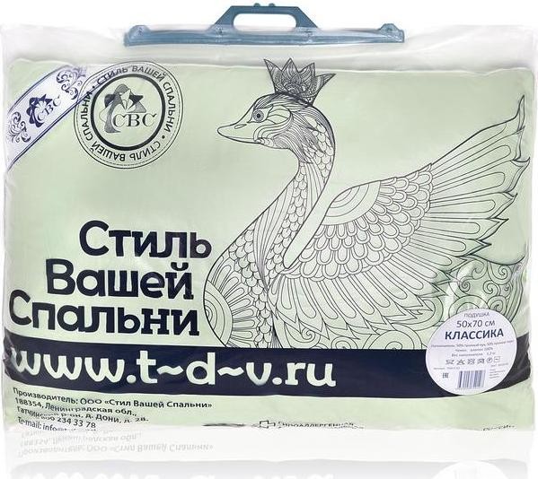 Ткань верха: пуходержащий однотонный тик (хлопок, 100%). Наполнитель: полупуховая смесь 1 категории (пух — 50%, перо — 50%). Кант: х/б, атласная этикетка-уголок с логотипом «СВС» на сатине. Фирменная индивидуальная упаковка в пакет с ручкой.