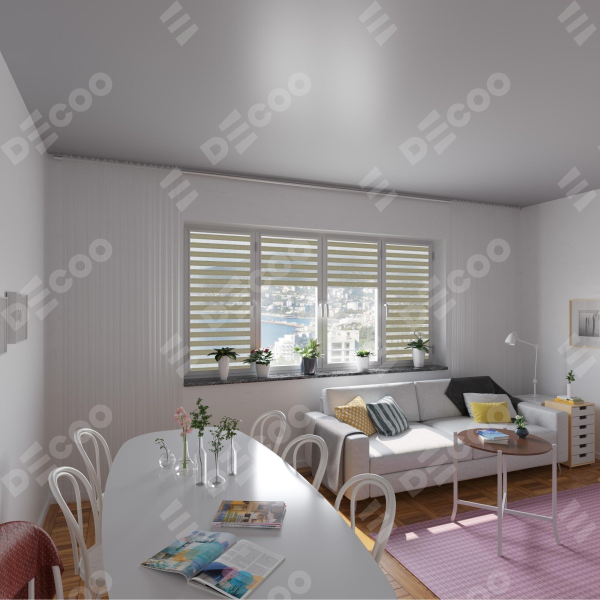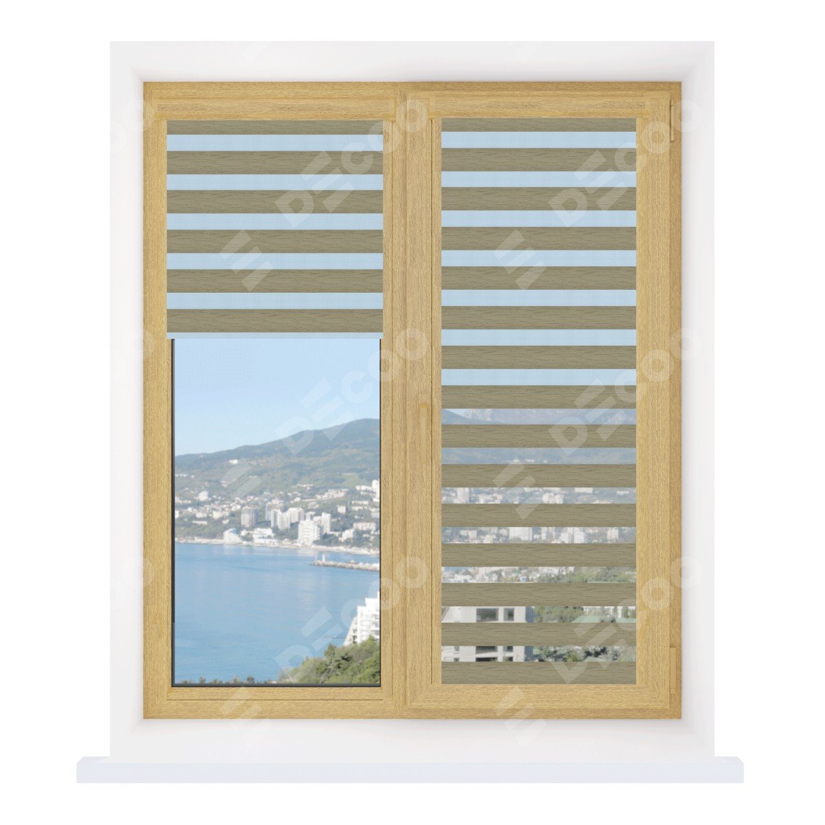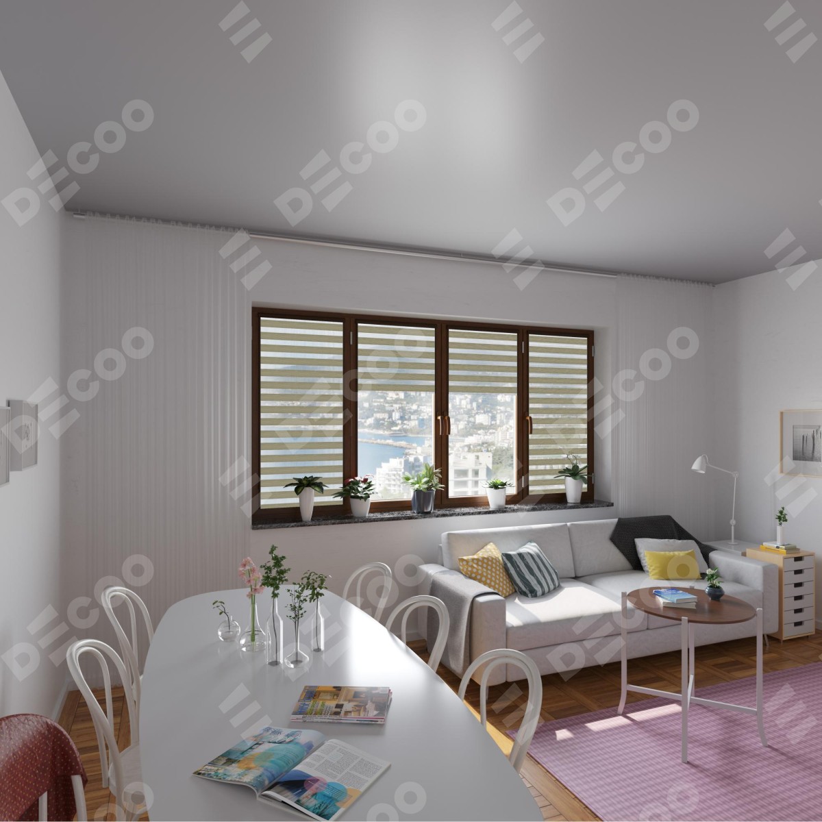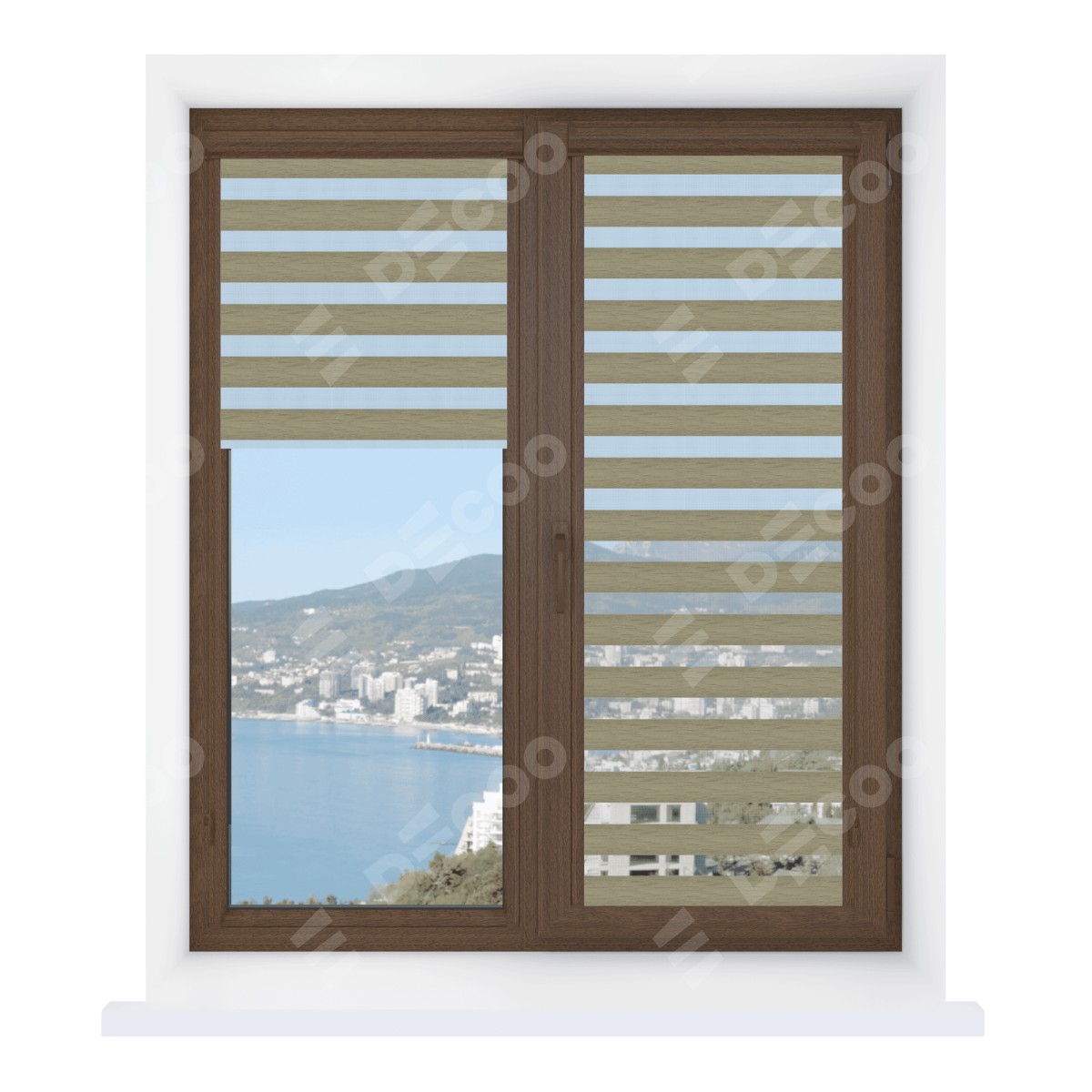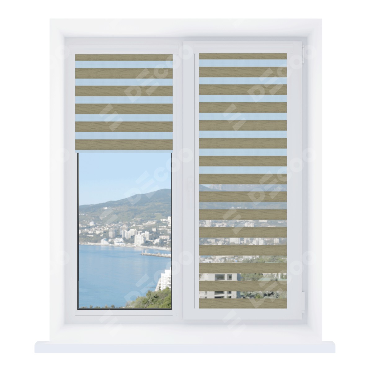 Рулонная штора День-ночь Уни 2 City 13 отлично подойдёт для интерьера: коттедж, на балконную дверь и детская.